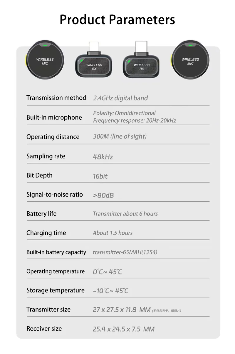 Transmitter Dimensions: 27×27.5 x 11.8 mm (excluding clip and magnetic clip)