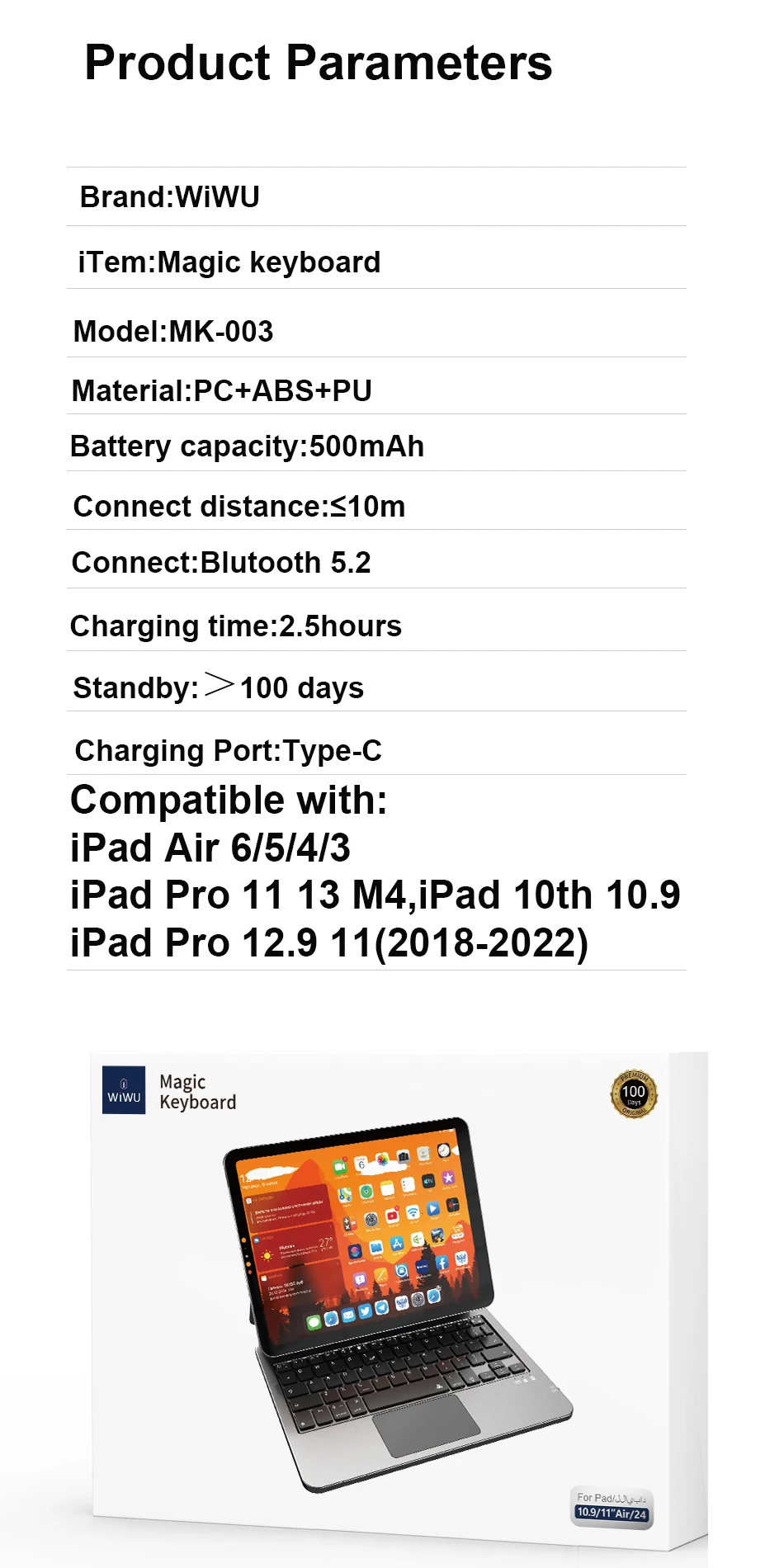 WiWU New Magic Keyboard for iPad Air 13 11 2024 Pro 11 13 Multi-touch Track pad Keyboard with Case for iPad Air 6 5 Pro 11 12.9