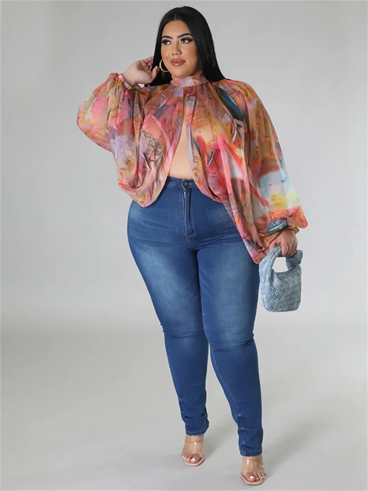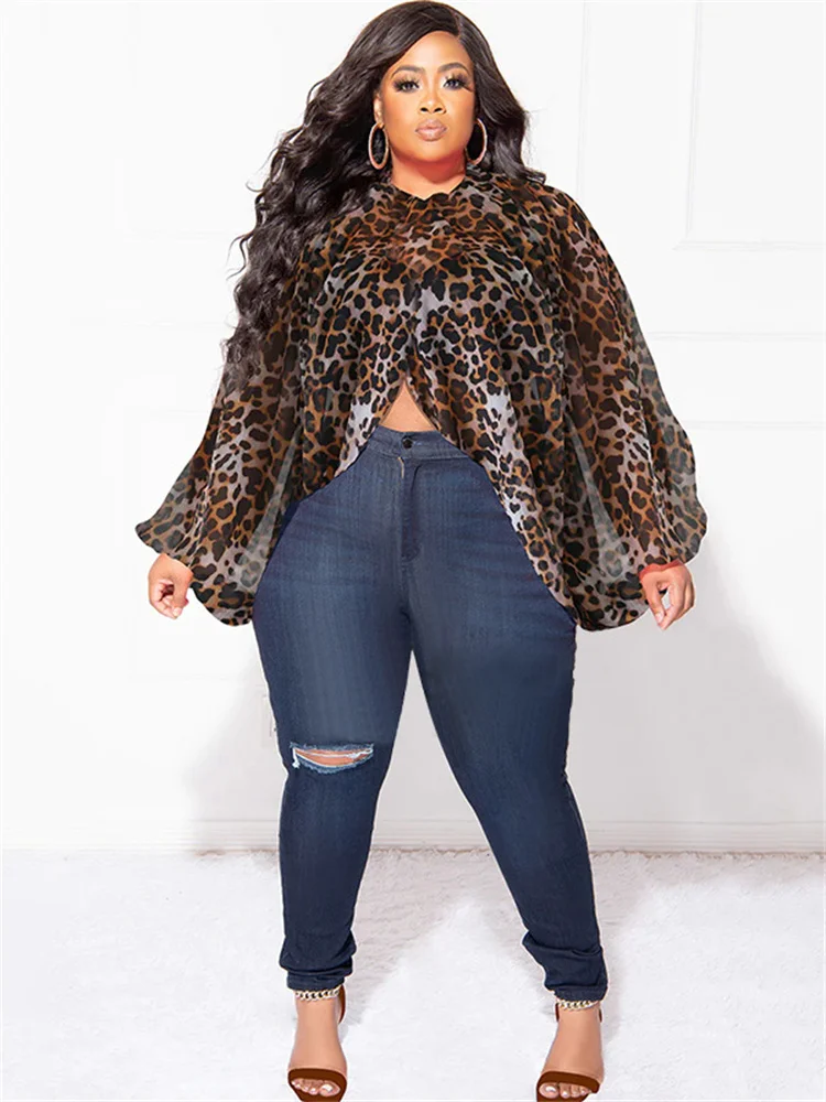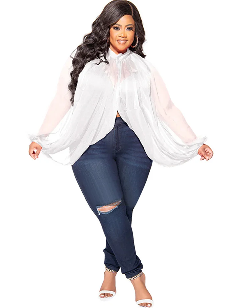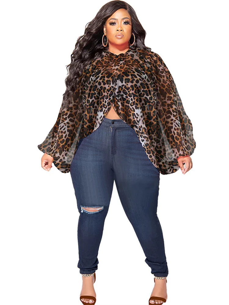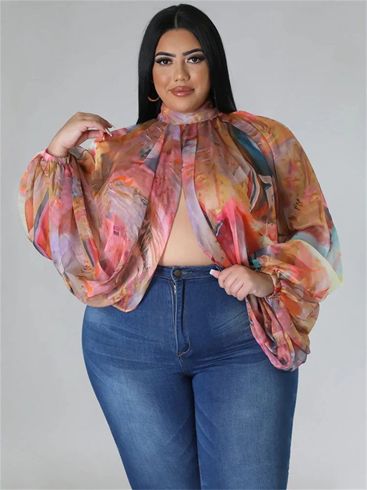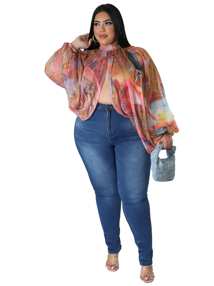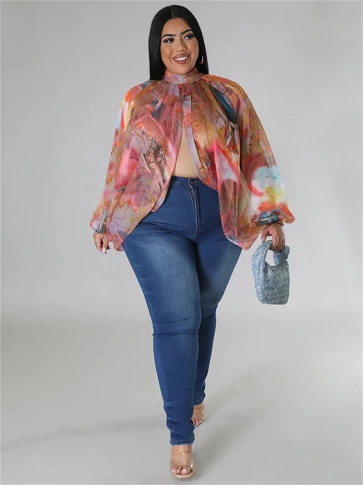 Wmstar Plus Size T-Shirts Print Women Tops Long Sleeve Open Loose Mesh See Through Sexy Chiffon Bulk