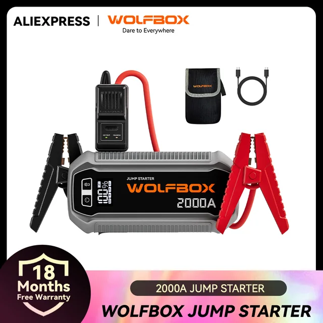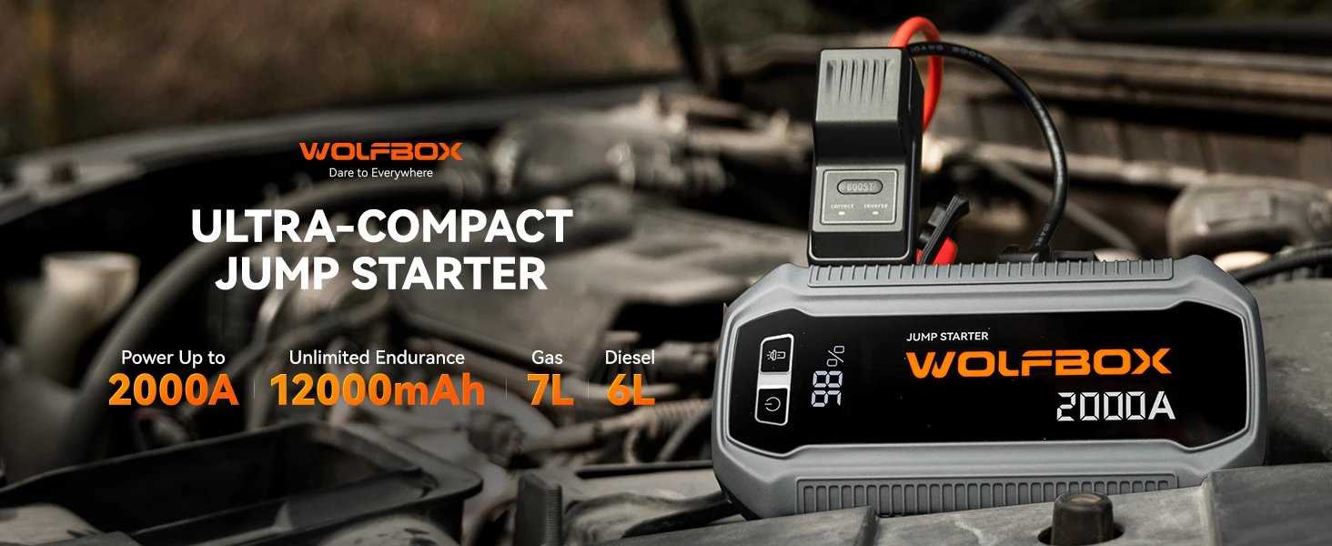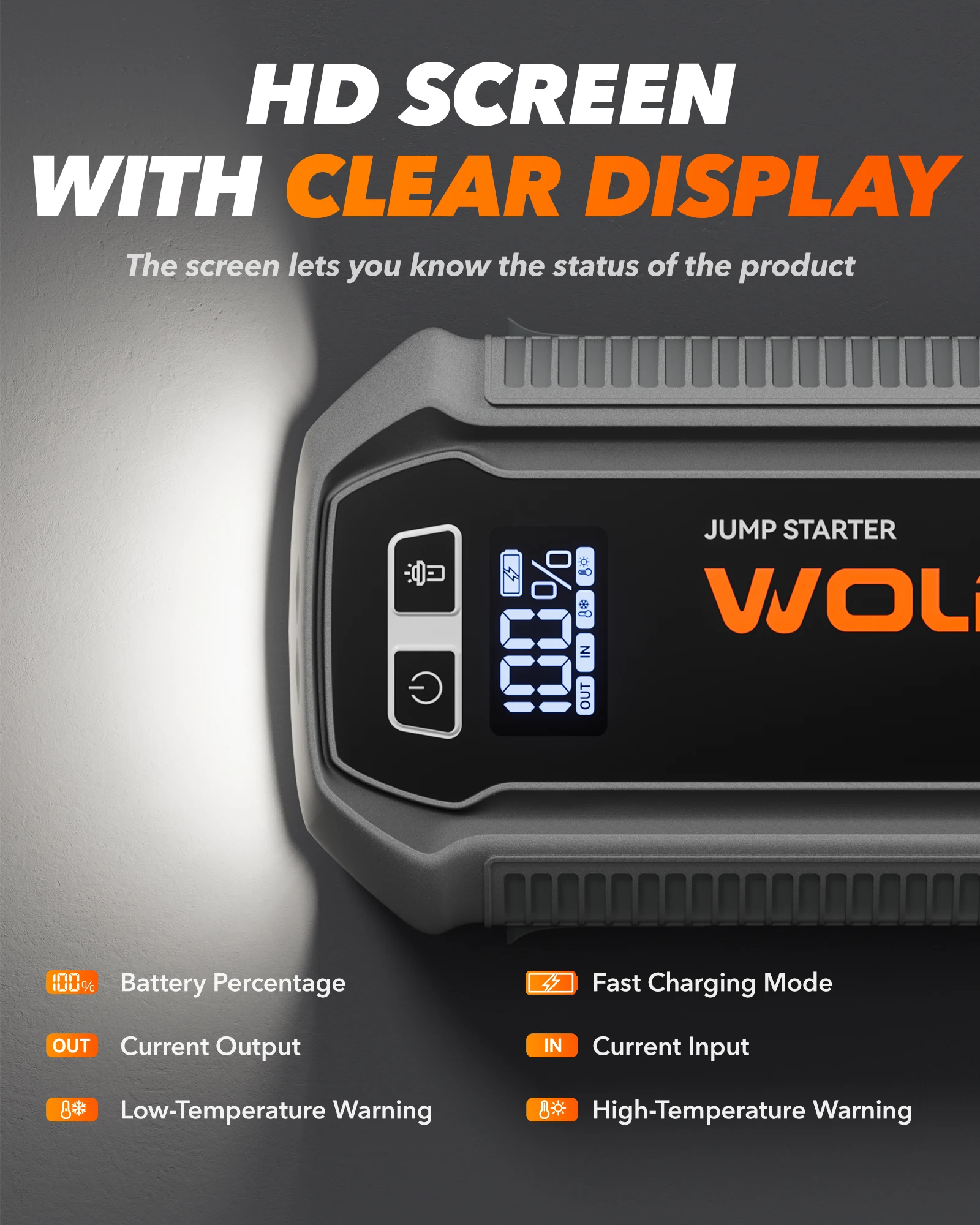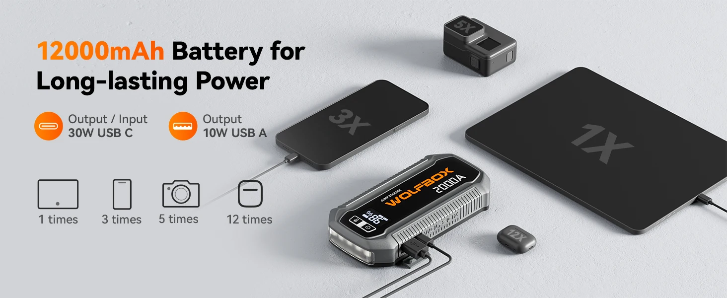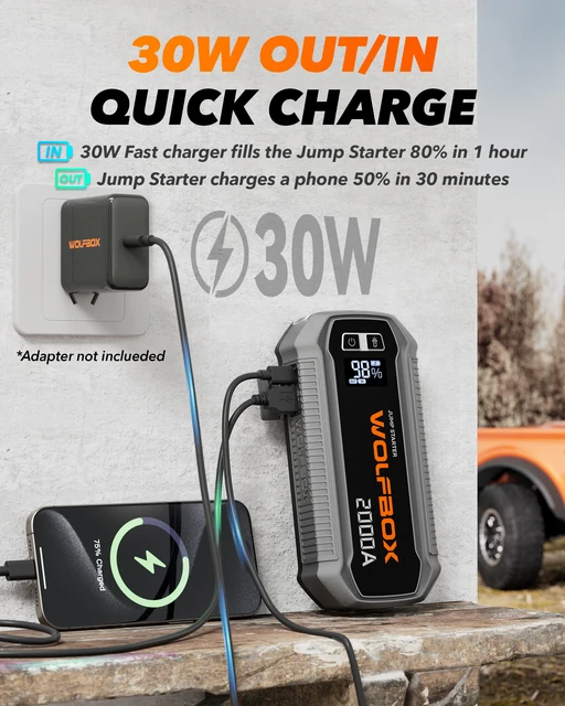WOLFBOX 2000A Jump Starter,12V Car Battery Jump Starter,30W Quick Charge 12000mAh for 8L Gas 6L Diesel