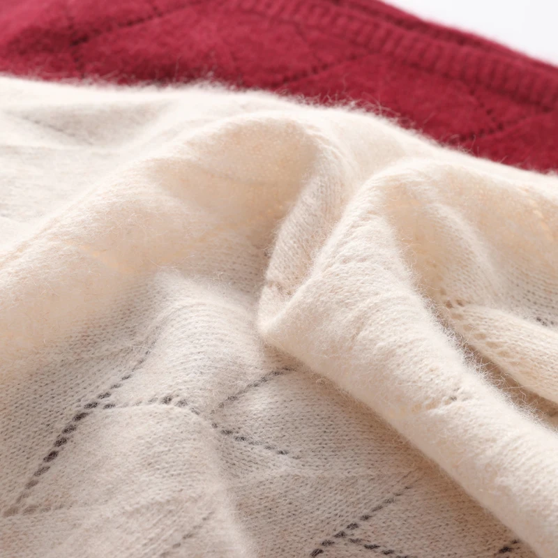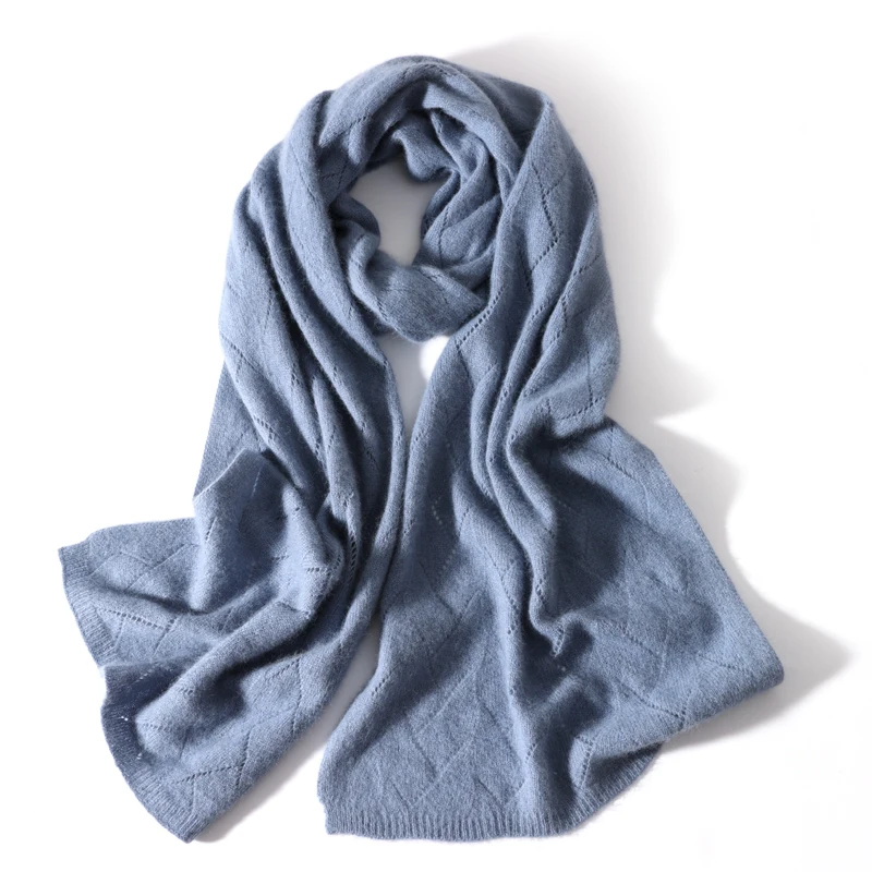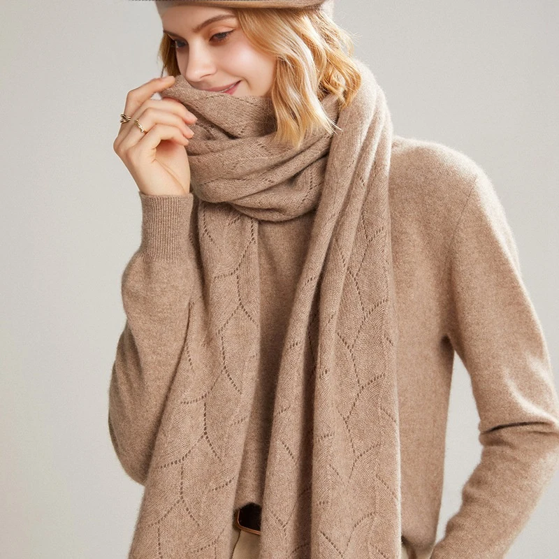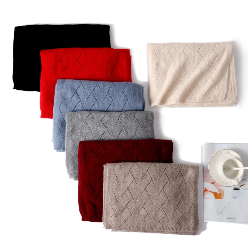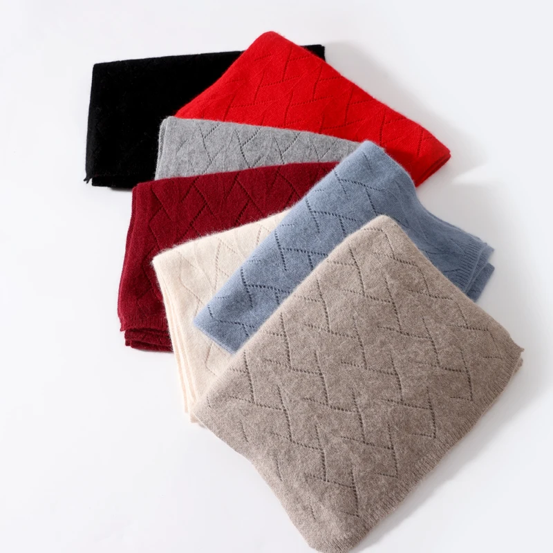 Women 100%Wool Knitted Long Scarf Autumn Winter Solid Fashion Hollow Out Shawls Soft Warm Cashmere Elegant
