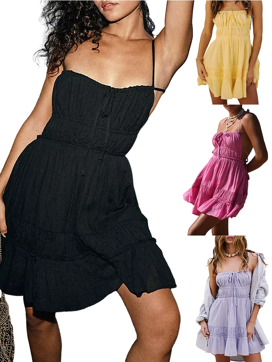 Women Backless Dress Casual Summer Solid Color Sleeveless Ruffled Party Dress for Cocktail Beach Club Streetwear