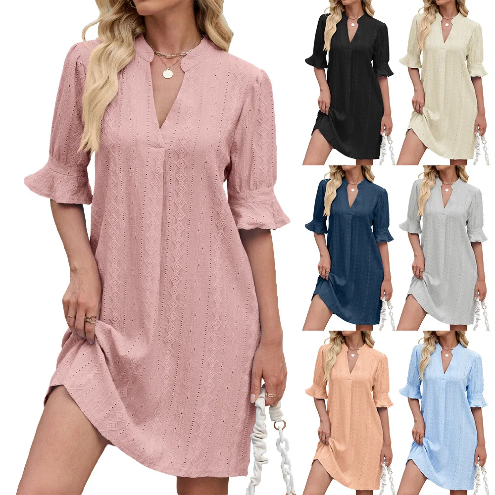 Cotton Dress Summer Elegant Solid Shirt Dress Women's Sundress Casual Lantern Half Sleeve Maxi Vestidos Female V Neck Robe