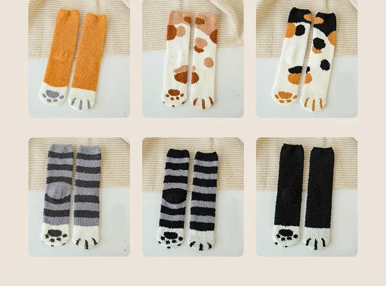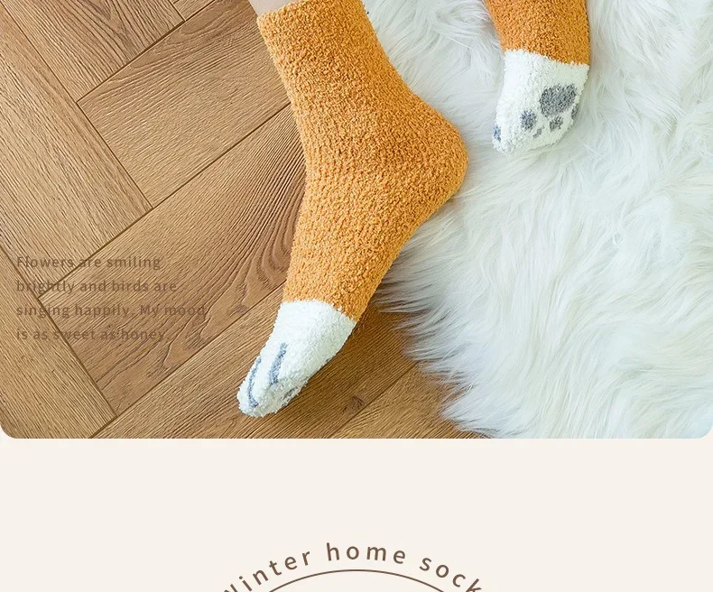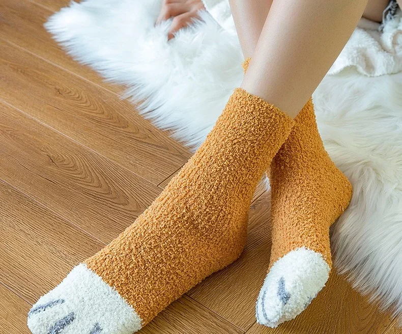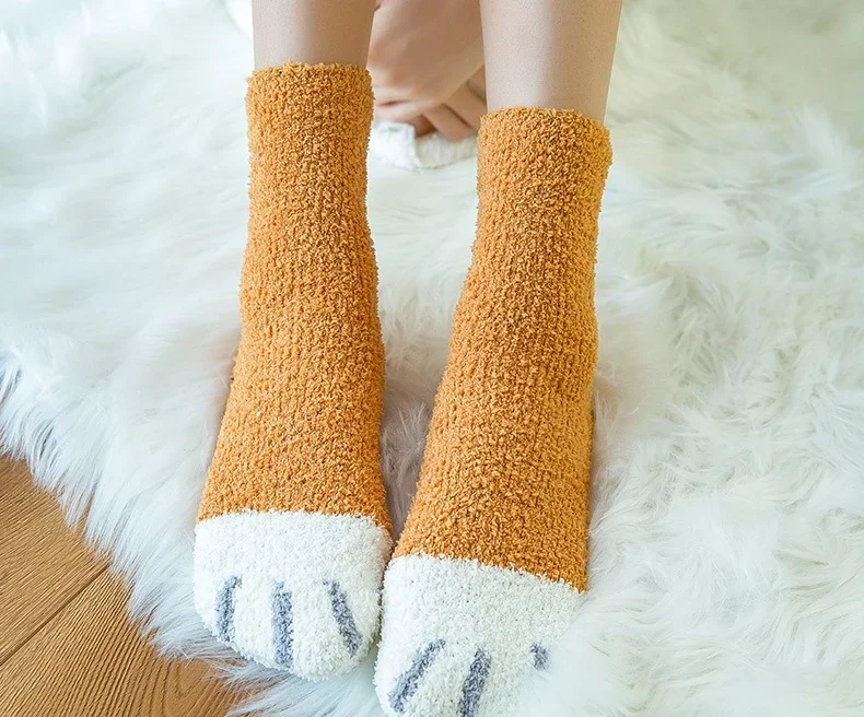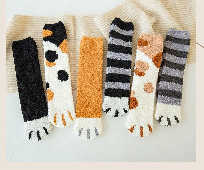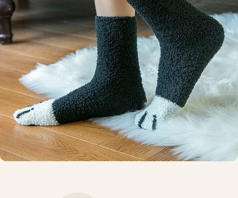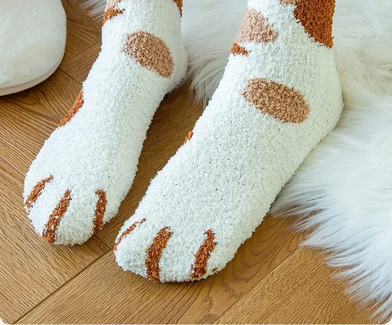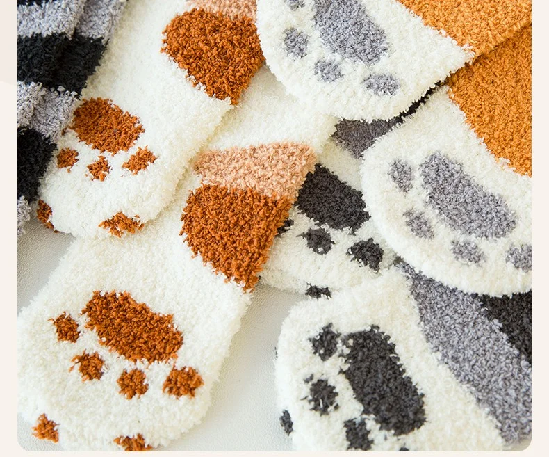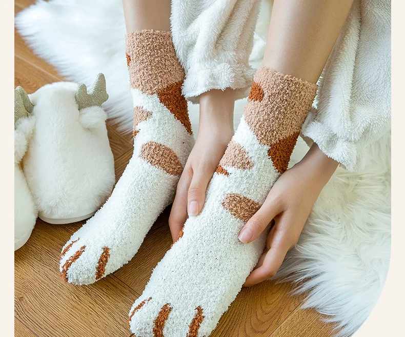 Women Cute Cat Paw Coral Fleece Socks Winter Thermal Thick Warm Fluffy Mid Calf Socks Non Slip Home Floor