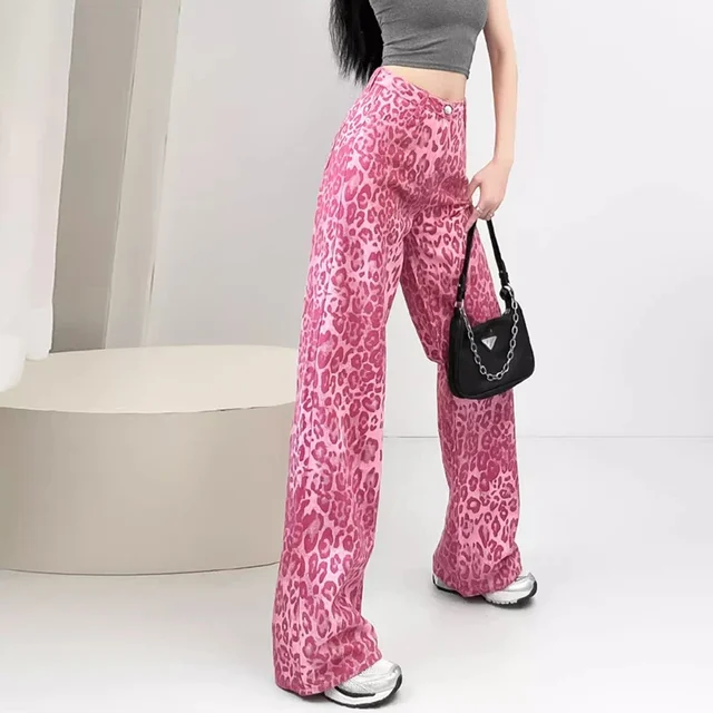 Women Fashion Pink Leopard Jeans Girls Baggy High Waist Casual Pants Female High Street Straight Leg