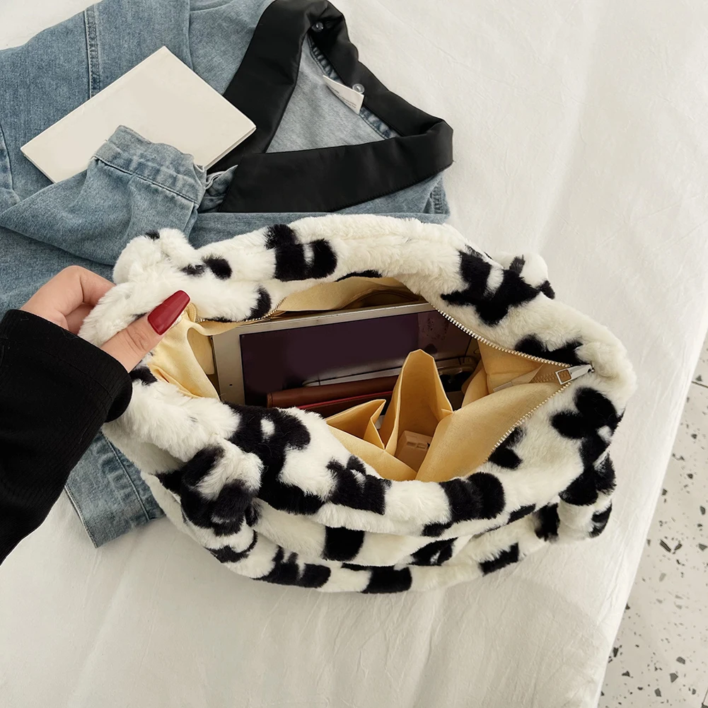 Women Fluffy Shoulder Bag Zipper Faux Fur Handbag Y2K Satchel Hobo Bag Plush Underarm Bag Fuzzy Tote Handbag Commuting Bag
