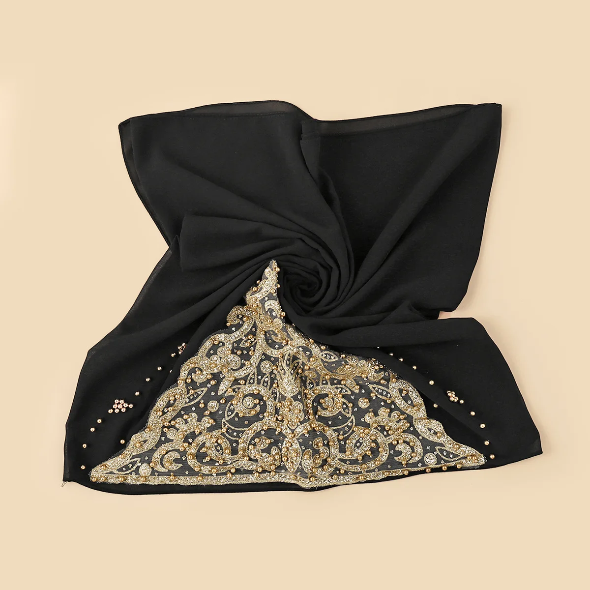 New Pearl Chiffon Diamonds Bow Tassel Scarf Hijab Muslim Women Shawl Wrap Turban Islam Stoles Bandanas Headband Bufanda Foulard