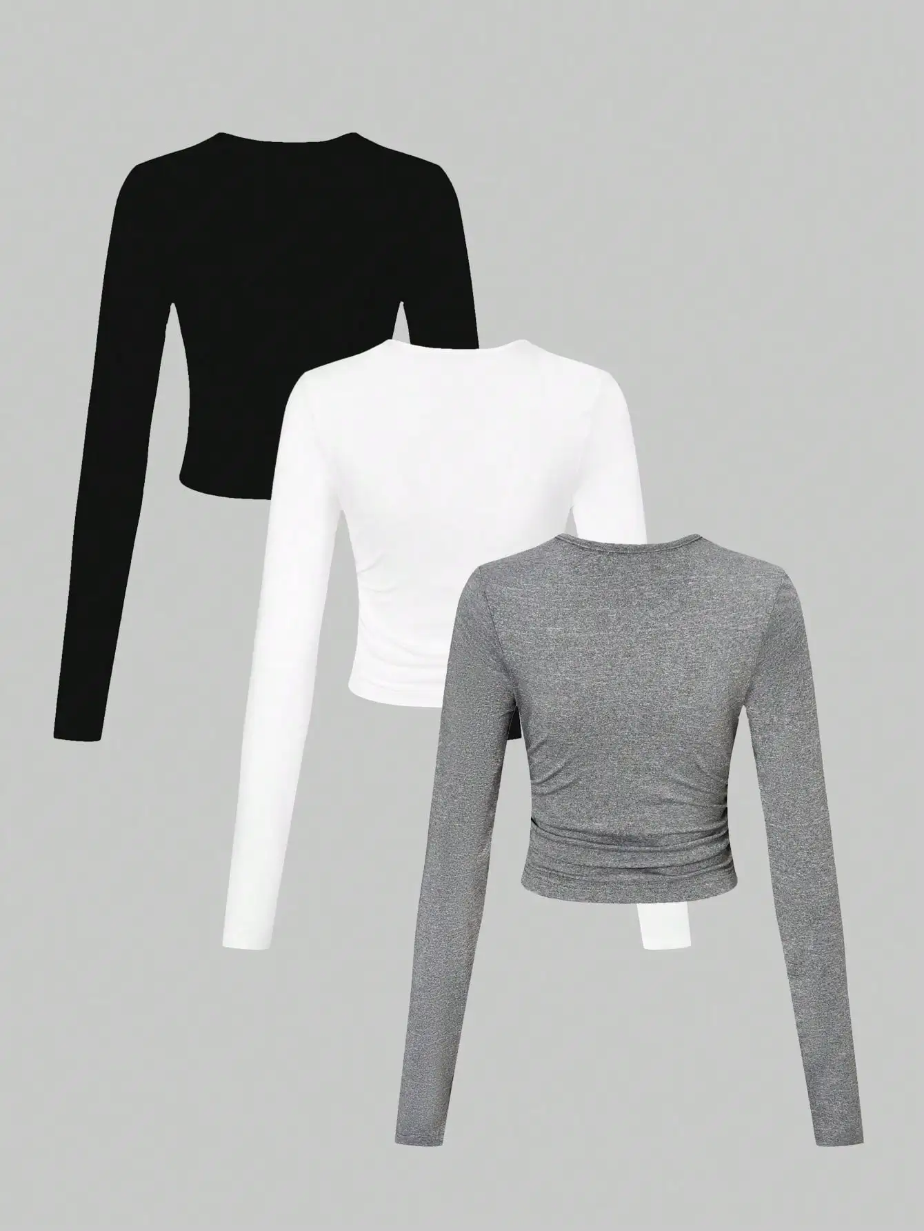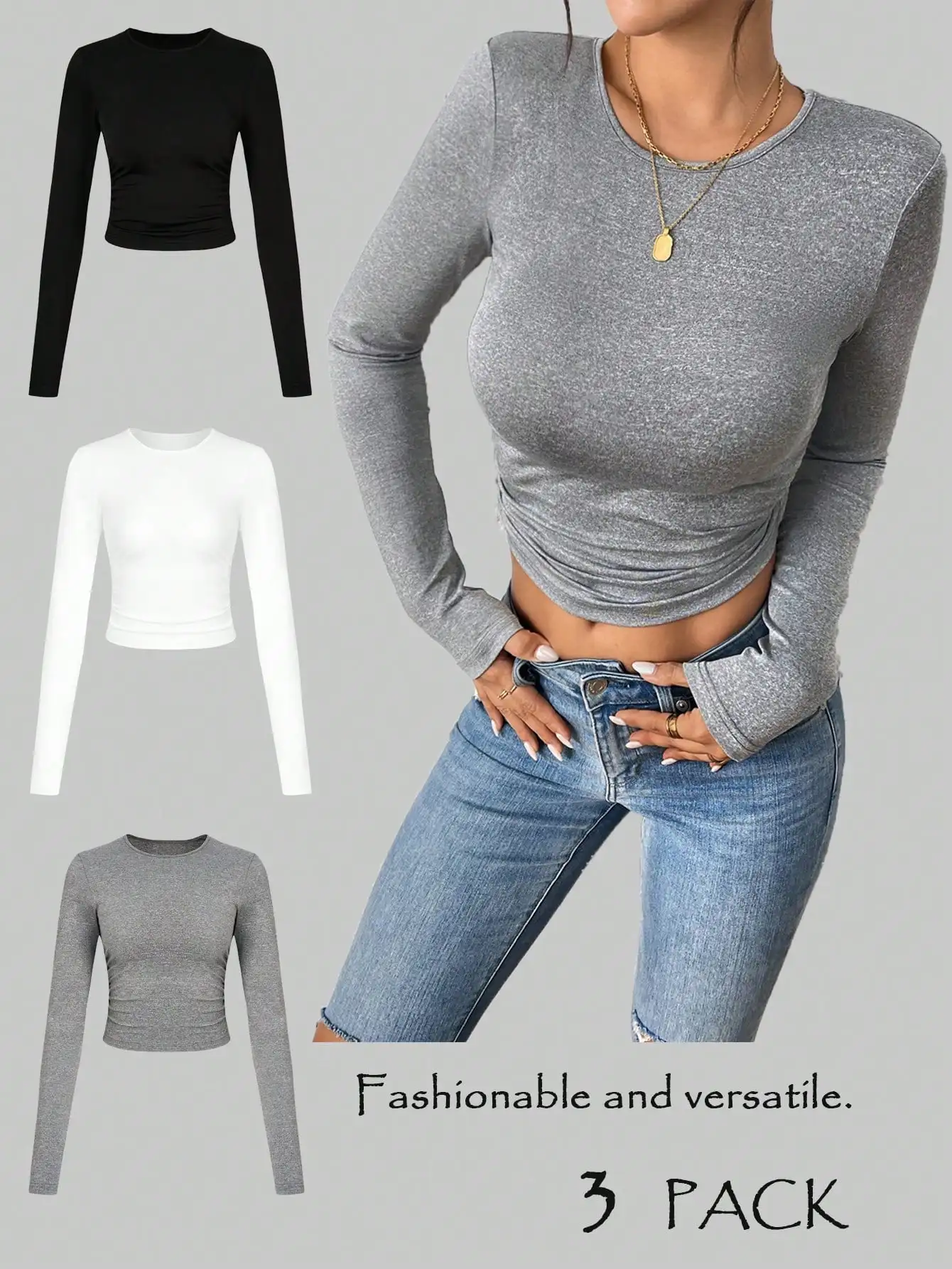 Women's 3-Piece Crew Neck Long Sleeve T-Shirt Set, Casual Daily Tops for All Seasons