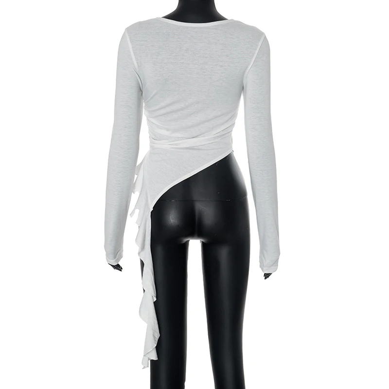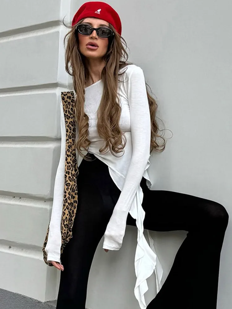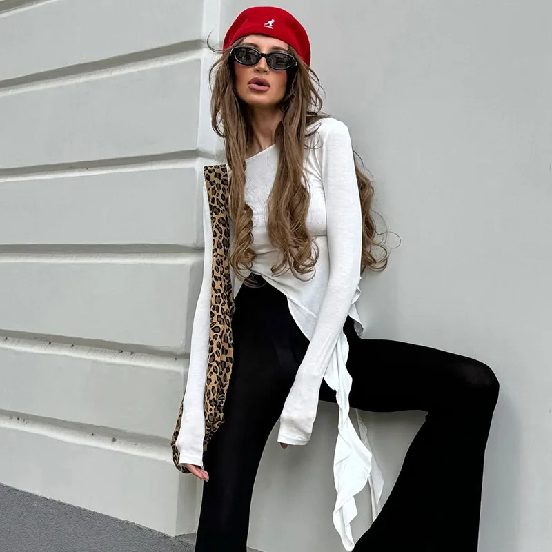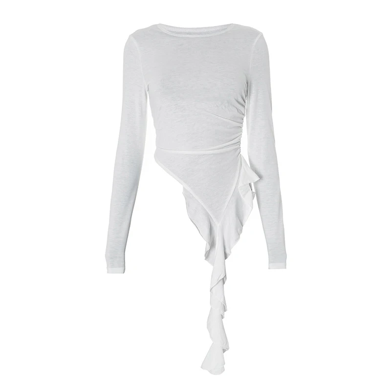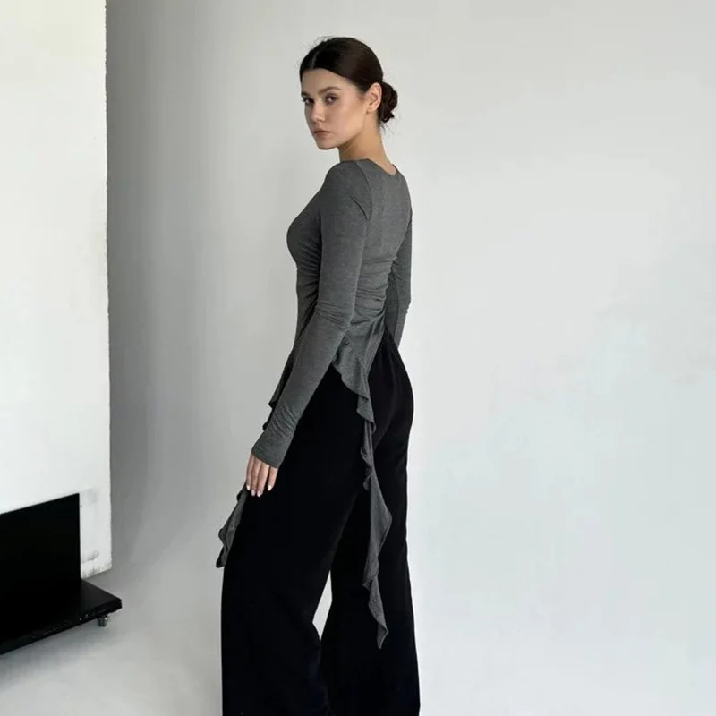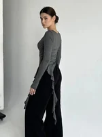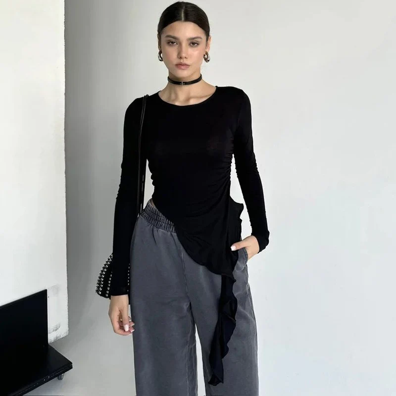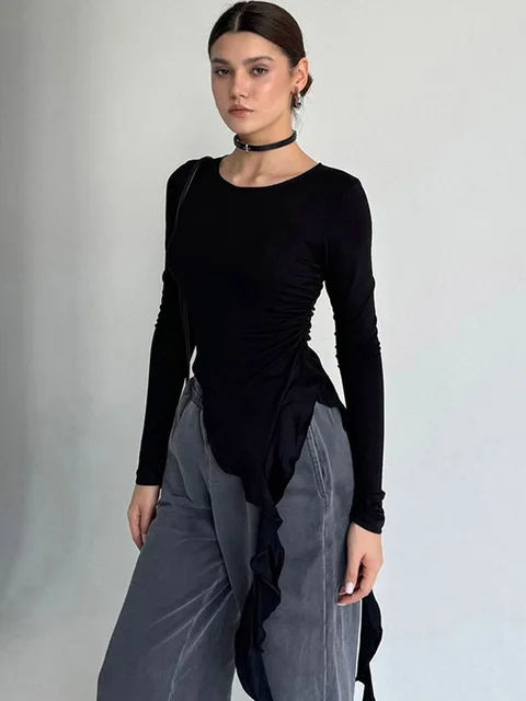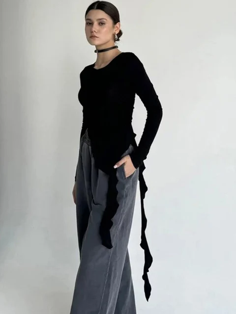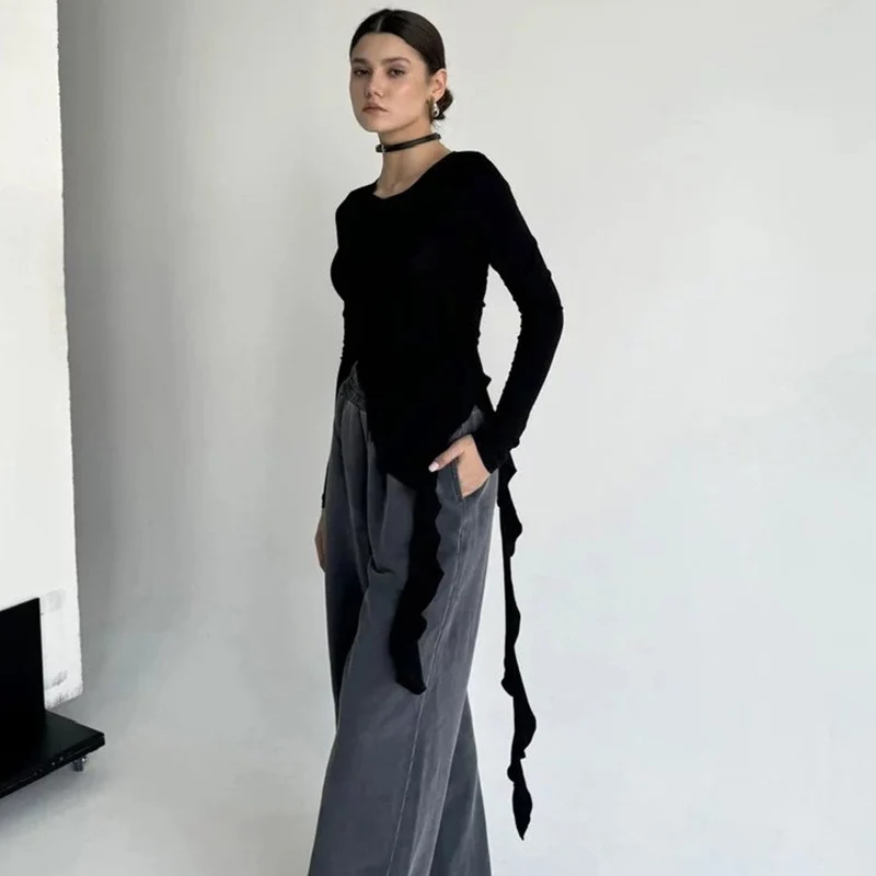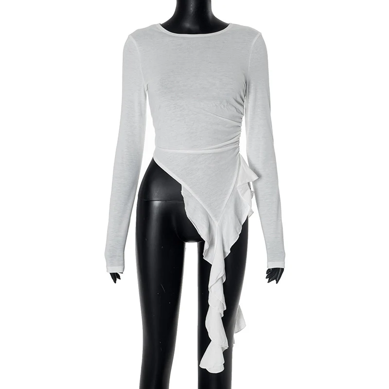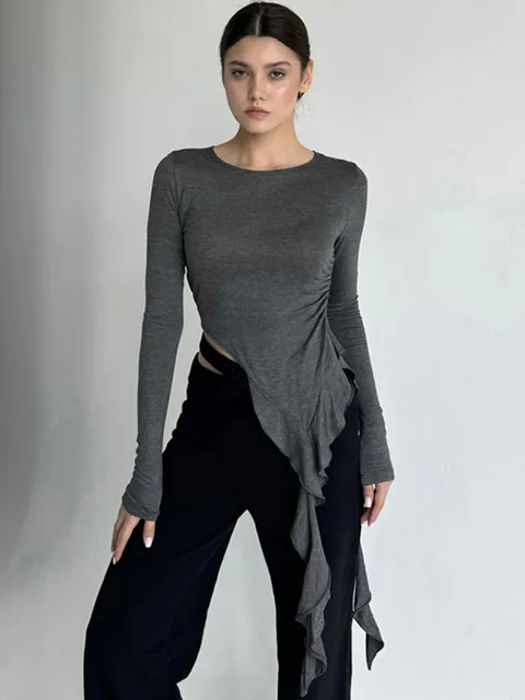Women's autumn slim fit irregular tassel solid color new long sleeved O-neck shirt slim fit top women's streetwear