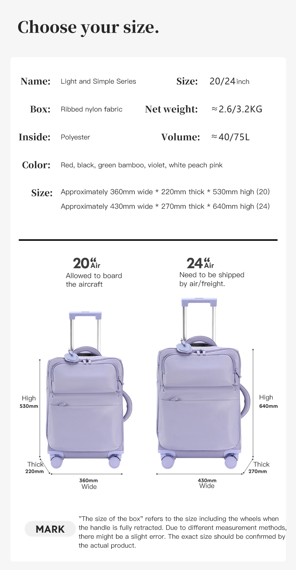 24 inches 64*27*43cm   3.4kg
