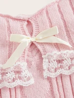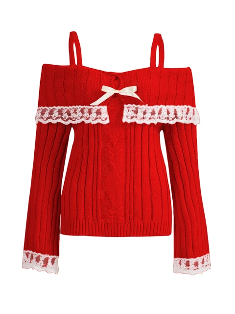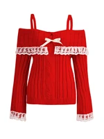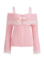 Women’s Cold Shoulder Sweaters Long Sleeve Contrast Lace Knit Pullovers Bow Front Jumper Tops