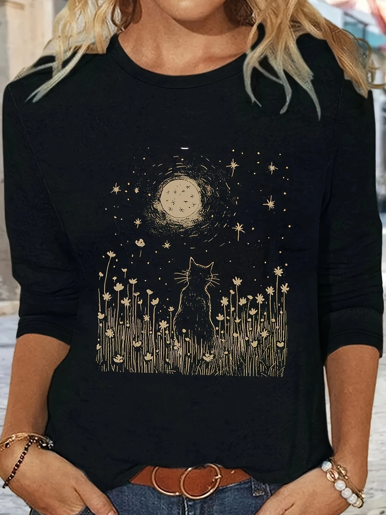 Women's Cotton Casual Long Sleeve Round Neck Cat T-Shirt Black Geometric Star & Moon Print Spring Fall  Whimsical Print Shirt