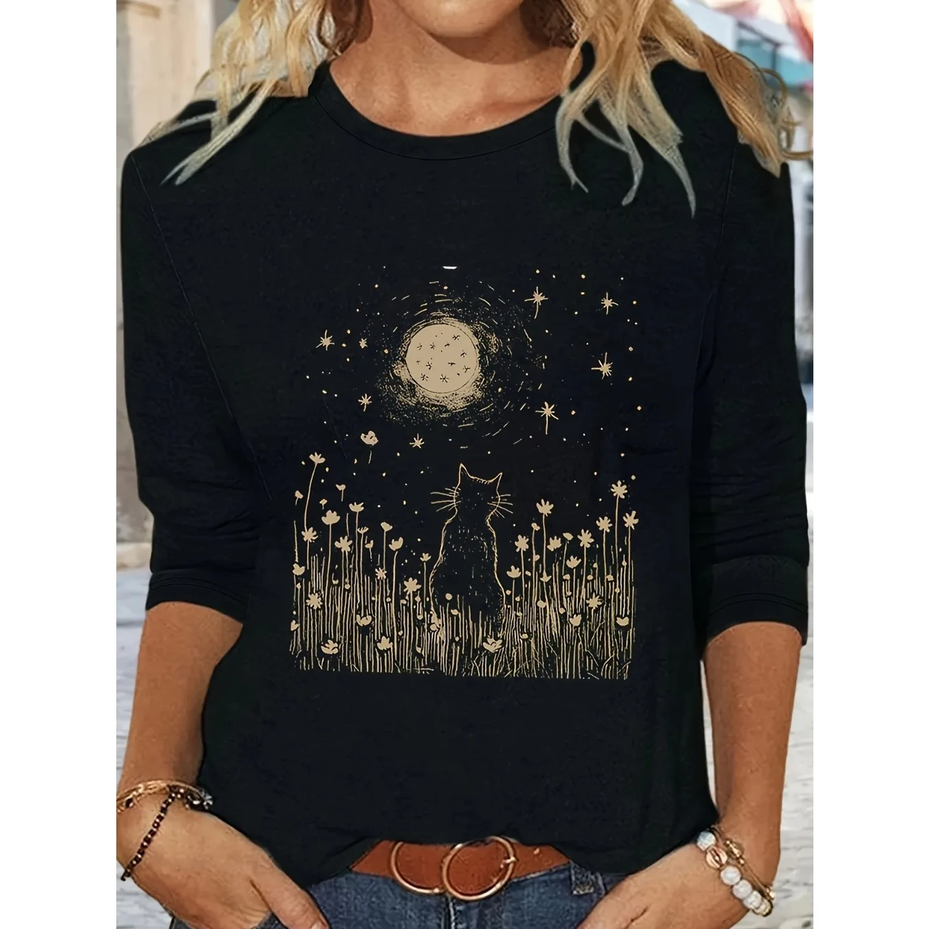 Women's Cotton Casual Long Sleeve Round Neck Cat T-Shirt Black Geometric Star & Moon Print Spring Fall Whimsical Print Shirt