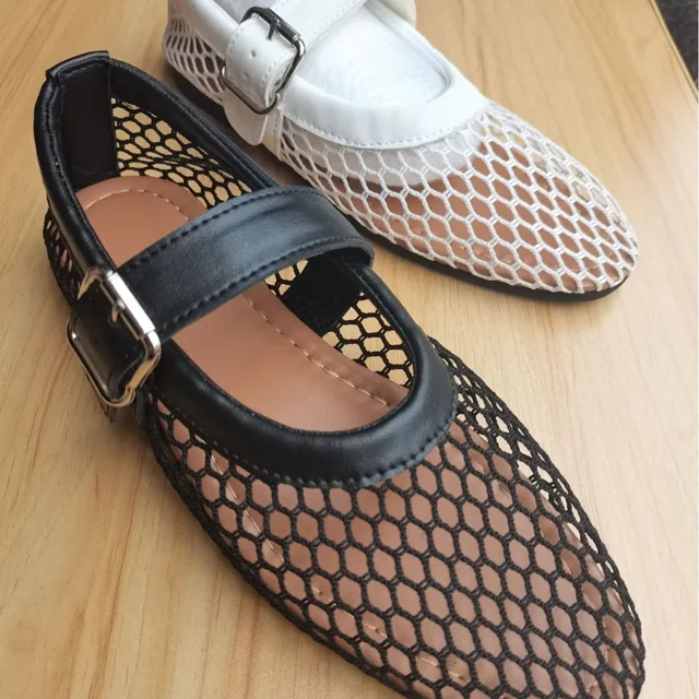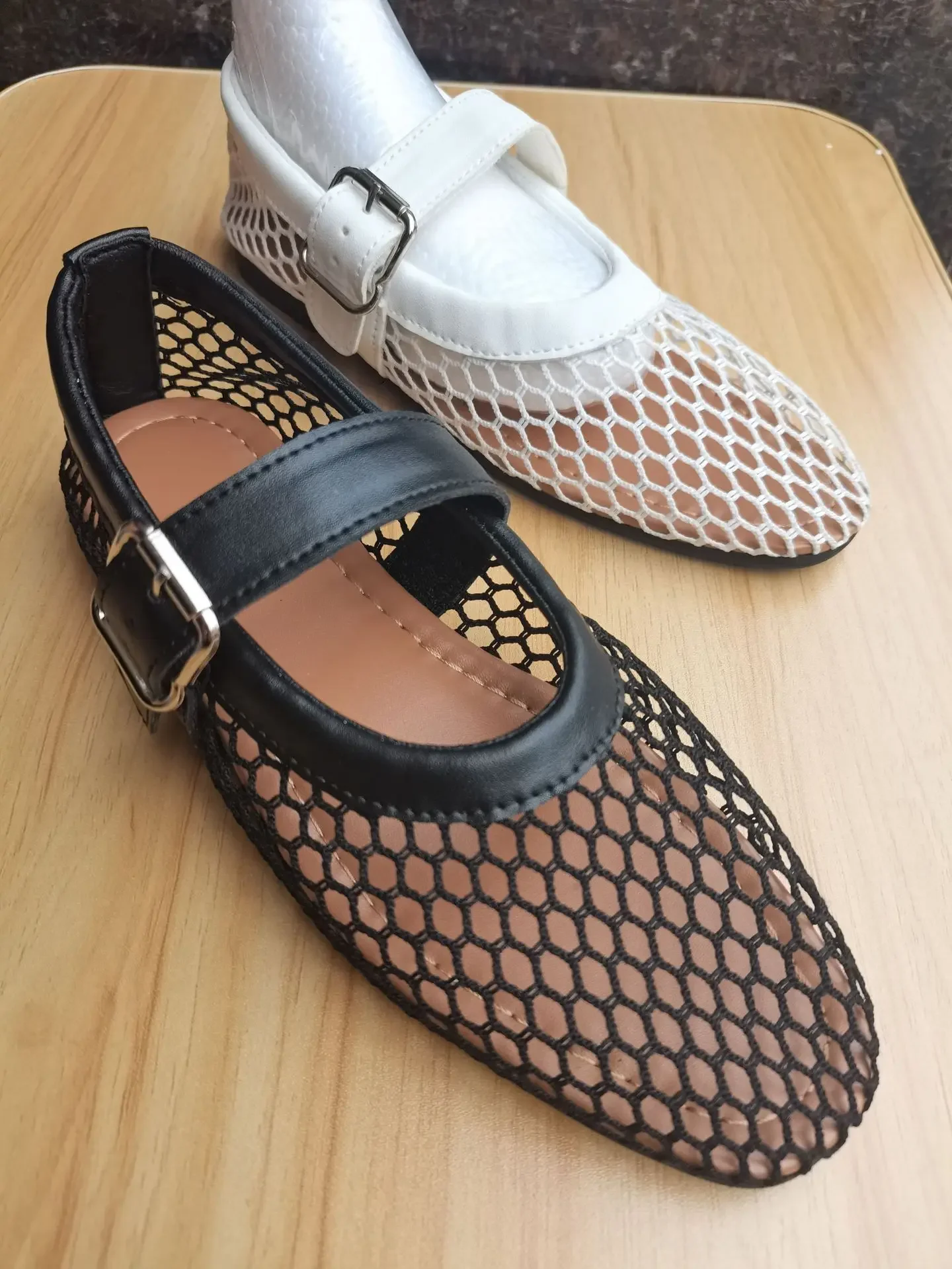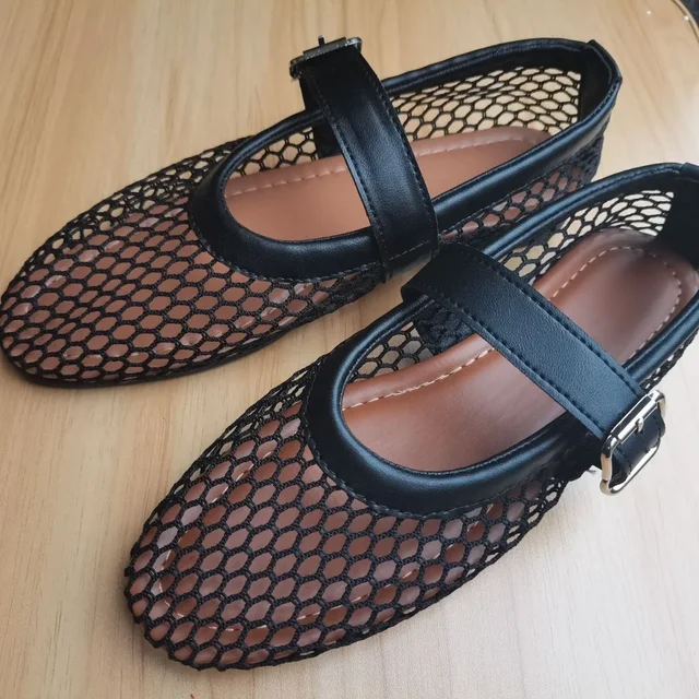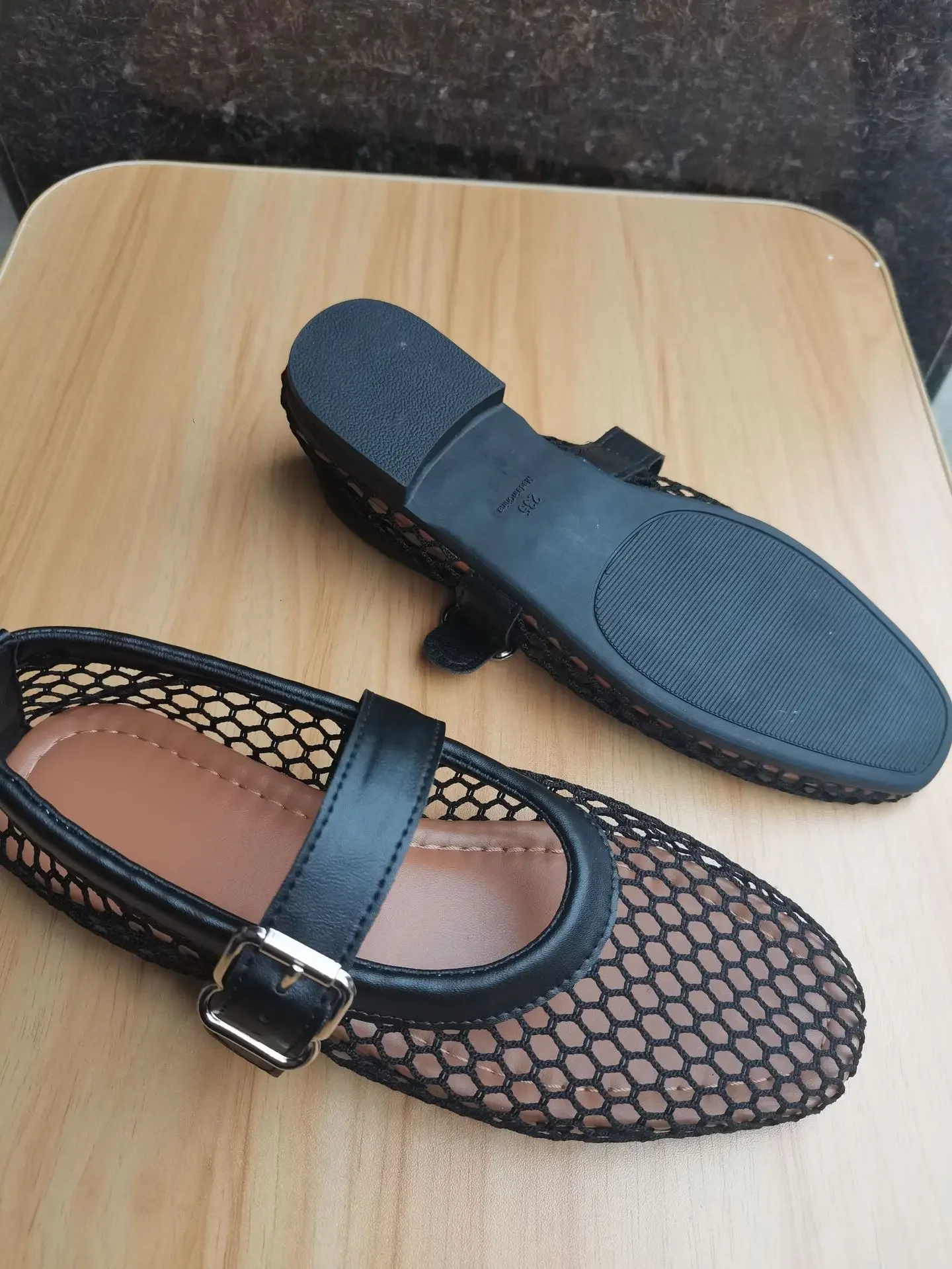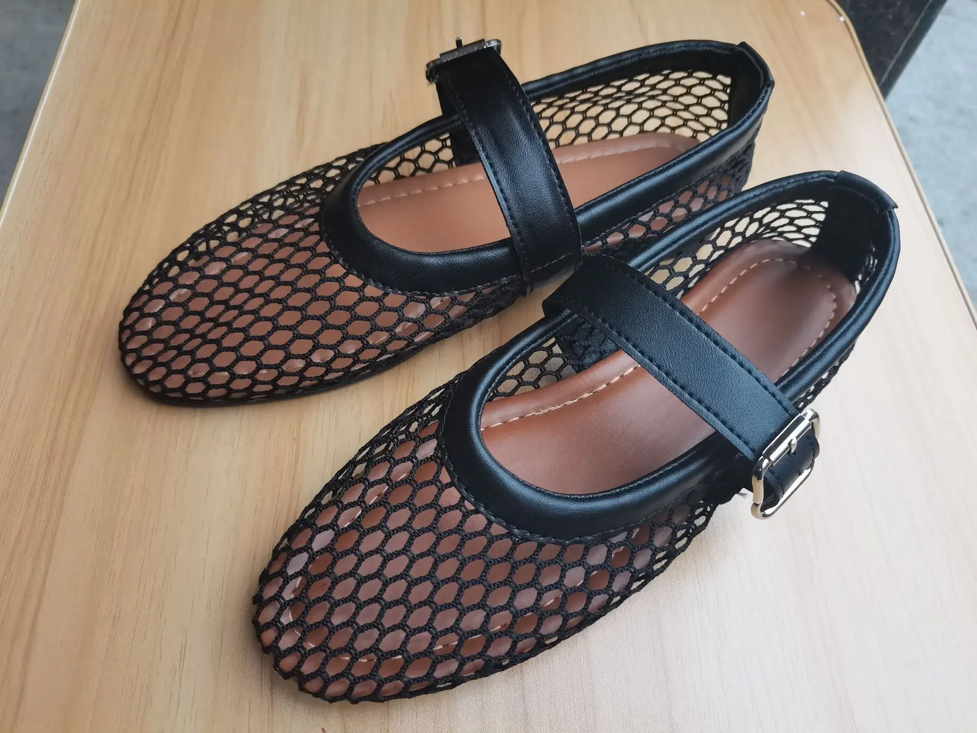 Women’s Flat Ballet Shoes round Head Mesh One-Strap Hollow out Mary Jane Fishing Net Shoes Breathable