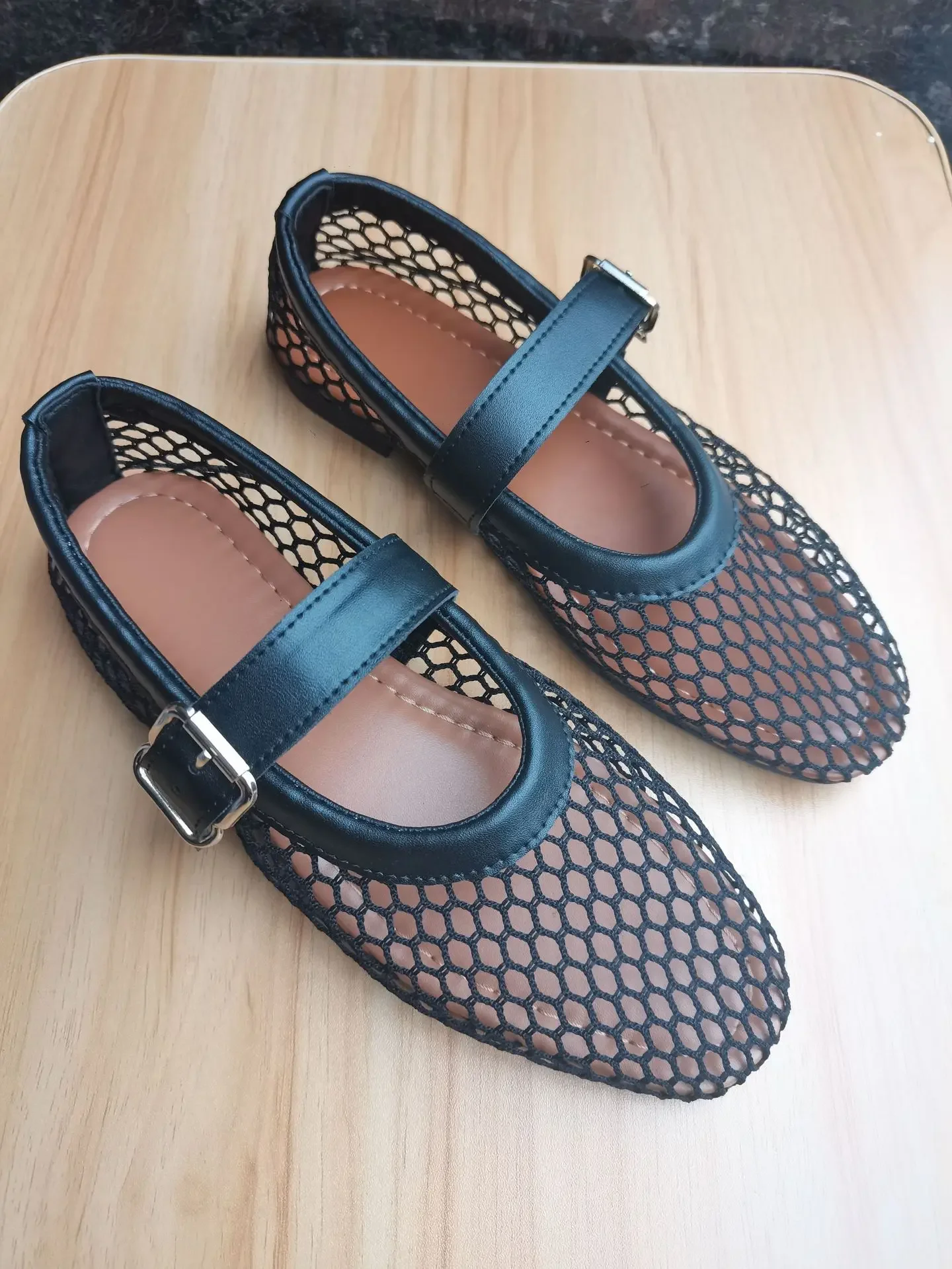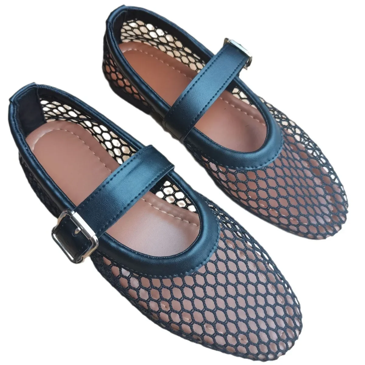 Women's Flat Ballet Shoes round Head Mesh One-Strap Hollow out Mary Jane Fishing Net Shoes Breathable Slip-On Footwear