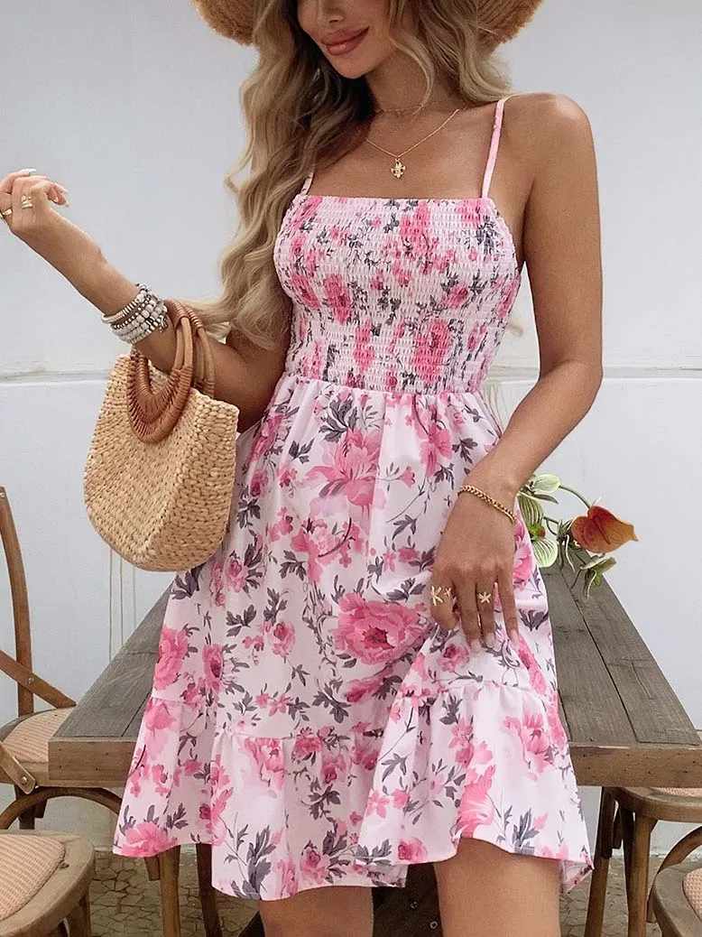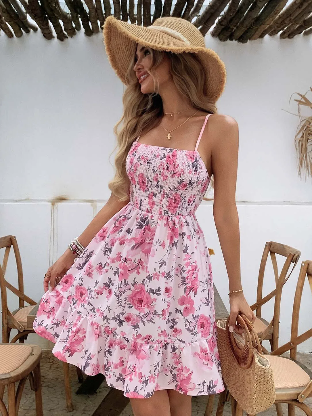 Women’s Floral Print Shirred Spaghetti Strap Dress – Summer Boho Ruffle Sundress Casual Beach