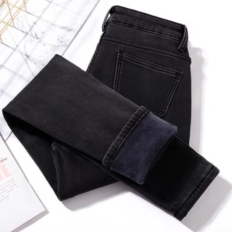Women’s High Waist Thiened Fce Lined Denim Jeans Autumn Winter Large Size New Korean Sle Elastic