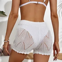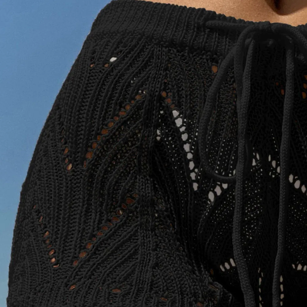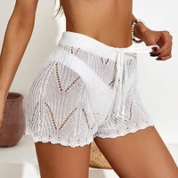 Feature: Contrast binding striped print, drawstring front, crochet hollow out, knitted cover up shorts.