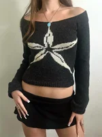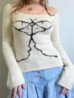 Women’s Off Shoulder Sweater Slim Graphic Print Long Sleeve Knit Tops Vintage Streetwear