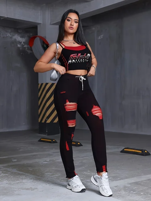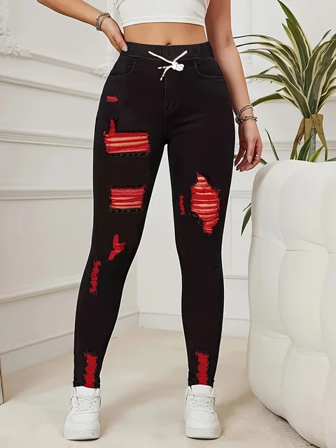 Showcases a trendy distressed red color with a skinny cut, ideal for the fashion-forward.