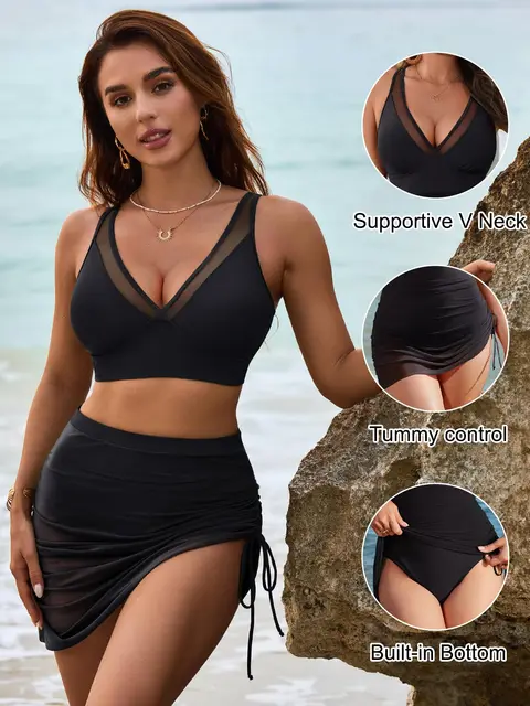 Slimming & Stylish: The high waisted bikini sets features a mesh sheer v-neck and sarong wraps, providing a fast-drying, stylish, and sexy look. The tummy control and ruched design flatter your figure, combining modesty with a touch of sexiness.