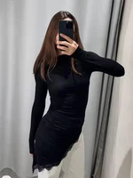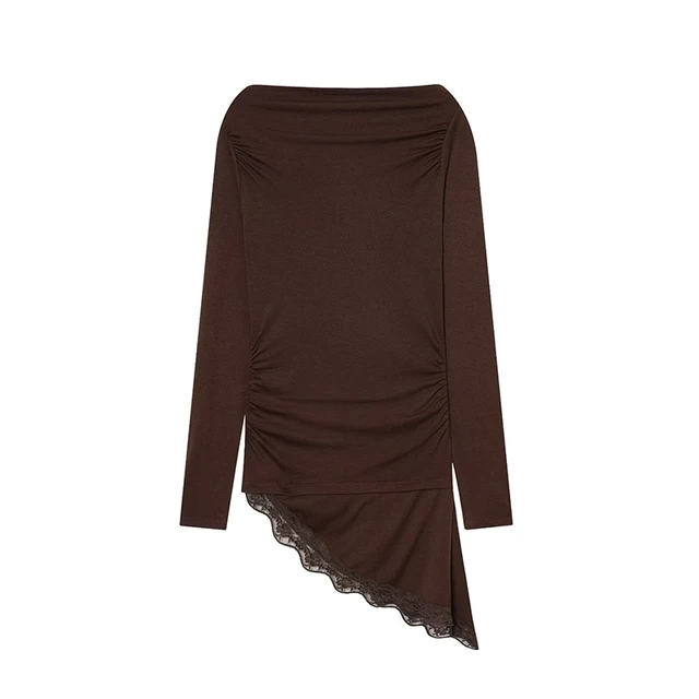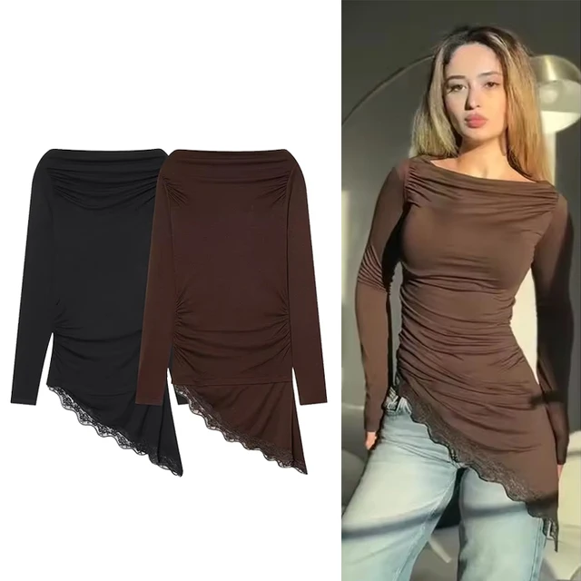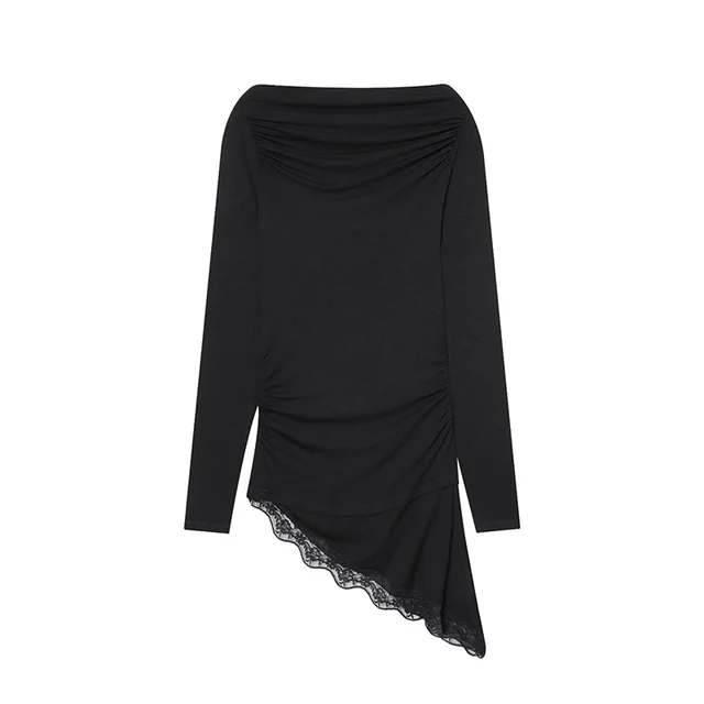 Women's T-Shirts Spring Autumn Fashion Lace Hem T Shirts for Women Asymmetry Streetwear Long Sleeve Slim Casual Tops
