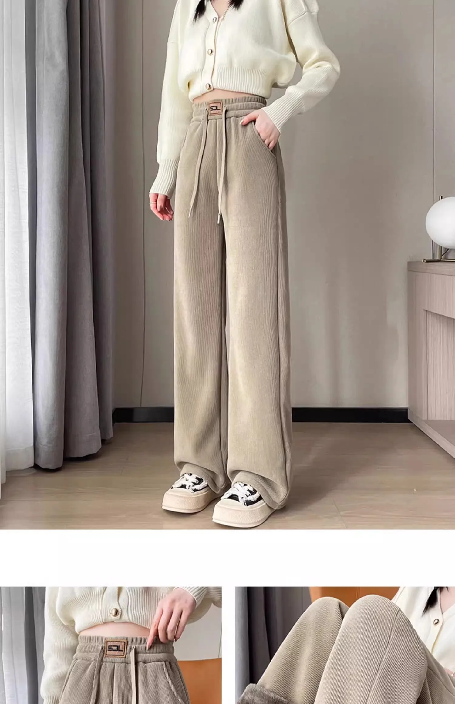 These pants feature a loose fit and a tie detail, ensuring a comfortable and adjustable wear for all-day comfort.