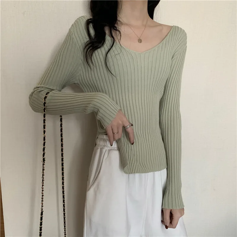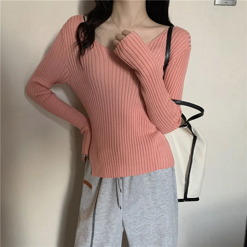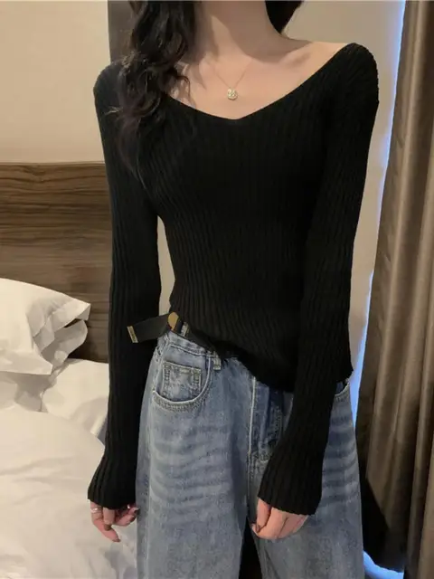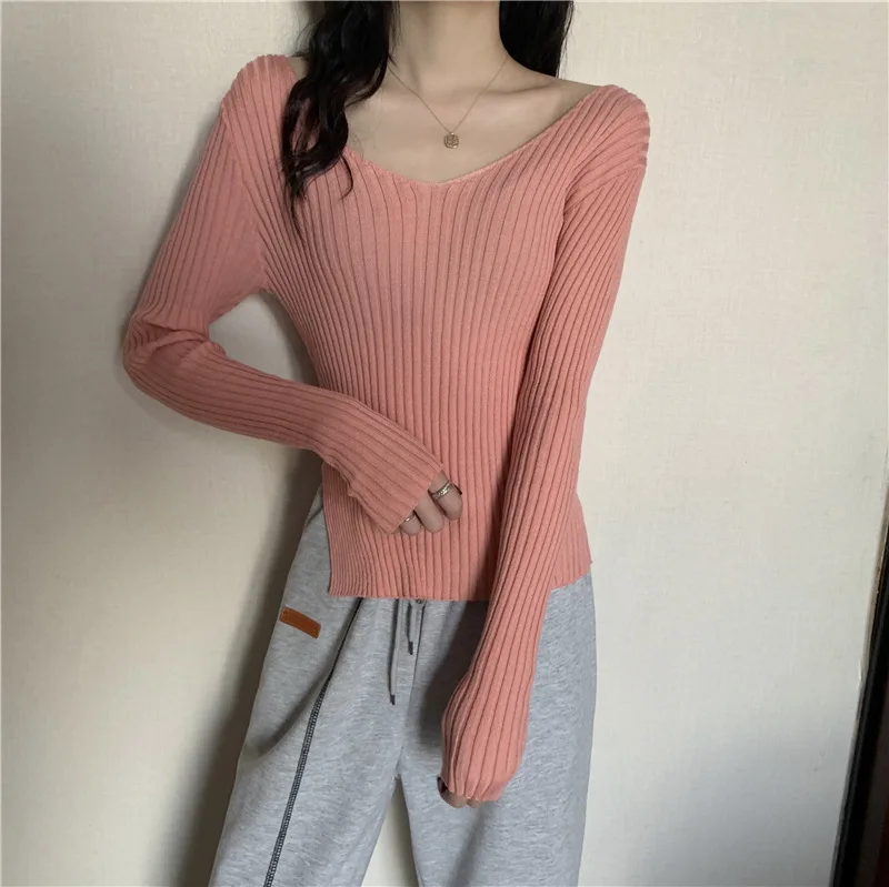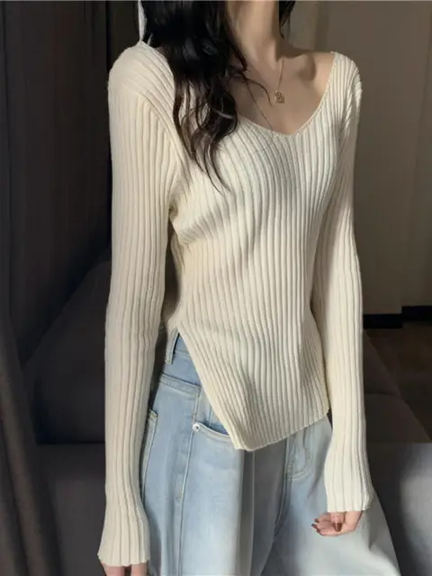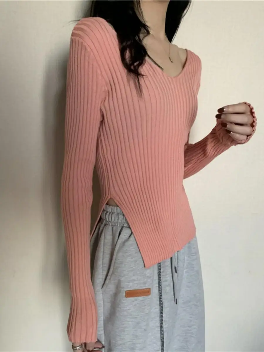 This knitwear features a trendy v-neck design, offering a modern and stylish look for the autumn season.
