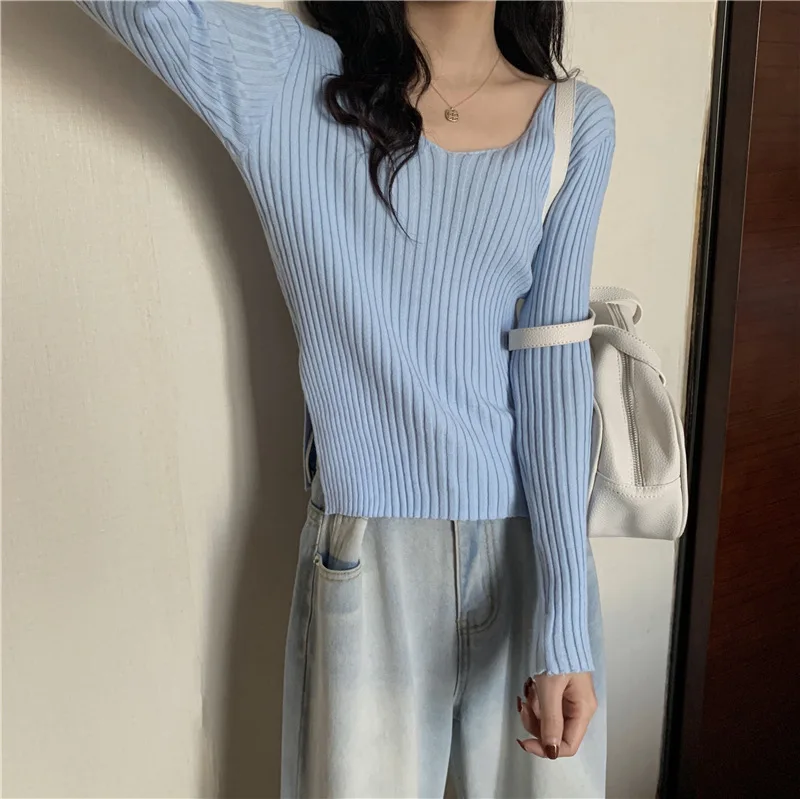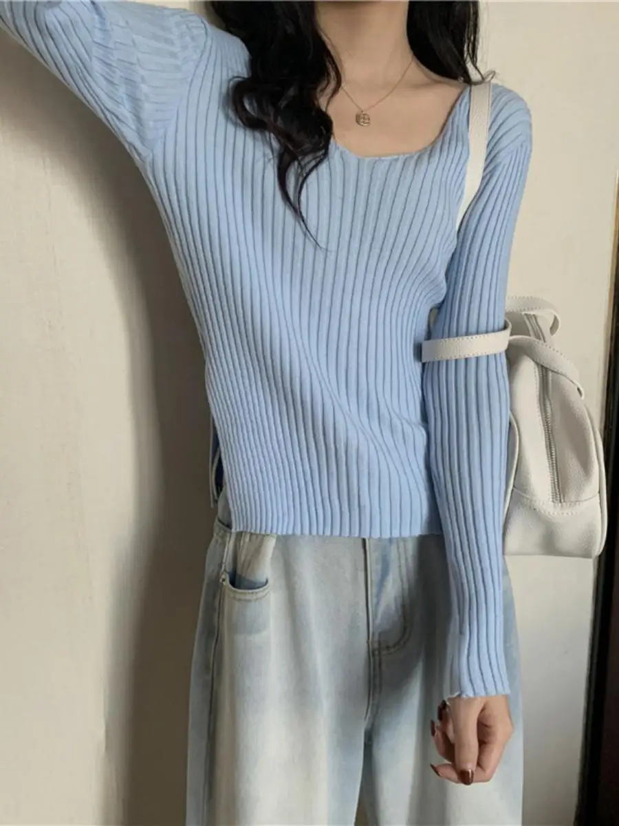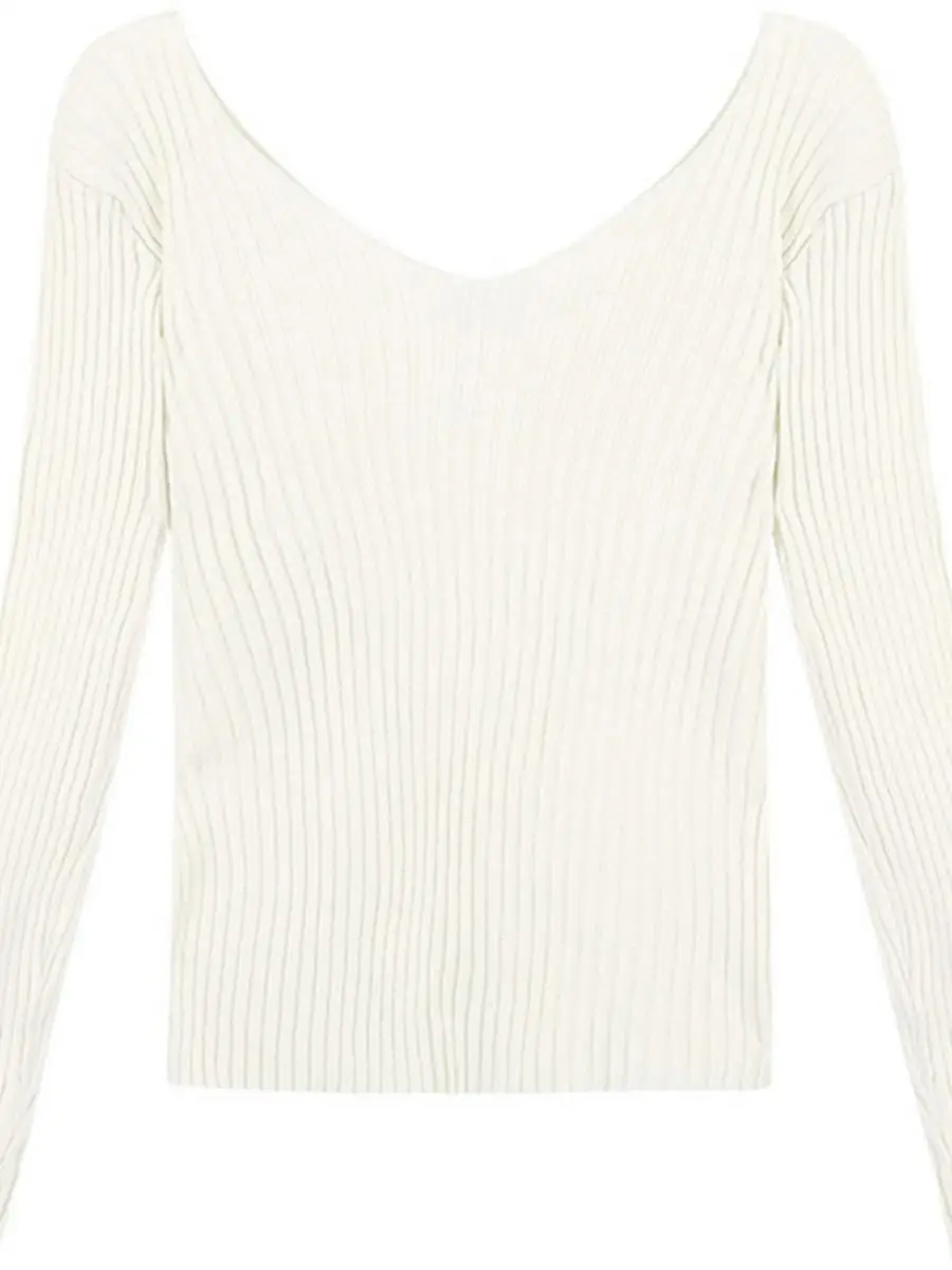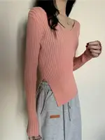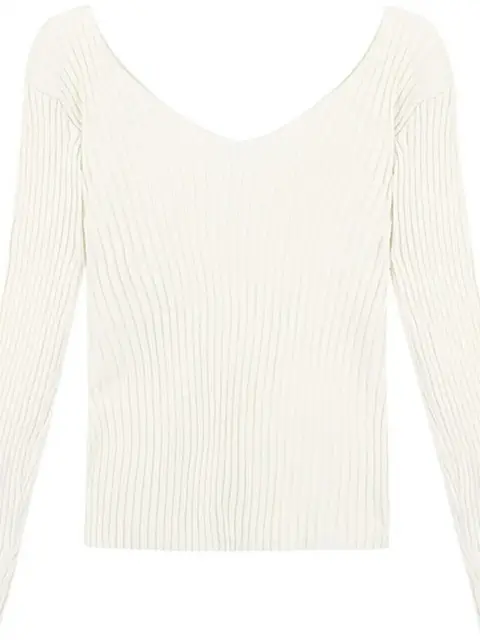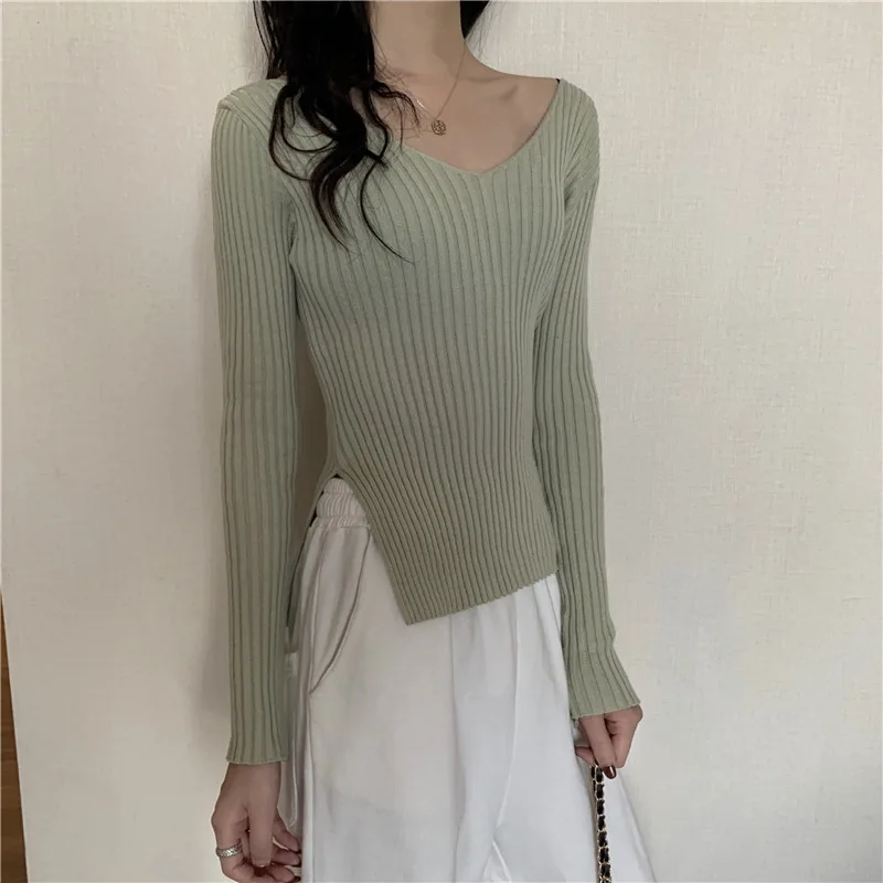 This knitwear features a trendy v-neck design, offering a modern and stylish look for the autumn season.