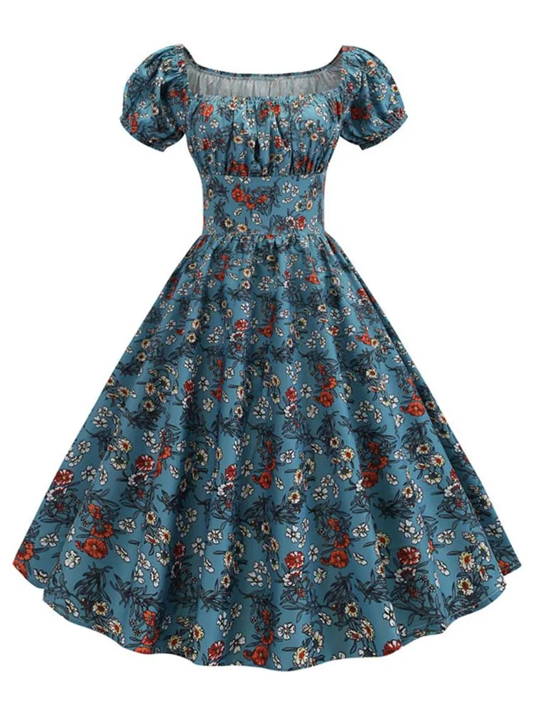 Cross-Border Bubble-Sleeve Floral Print Dress Square-Neck Fishbone Skirt Large Hemline Women's Fashion Dress from Mainland China