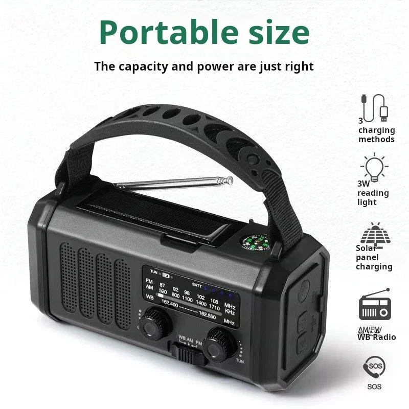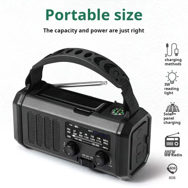 ① SOS alarm function ② power bank ③ flashlight ④ reading light ⑤ radio ⑥ compass