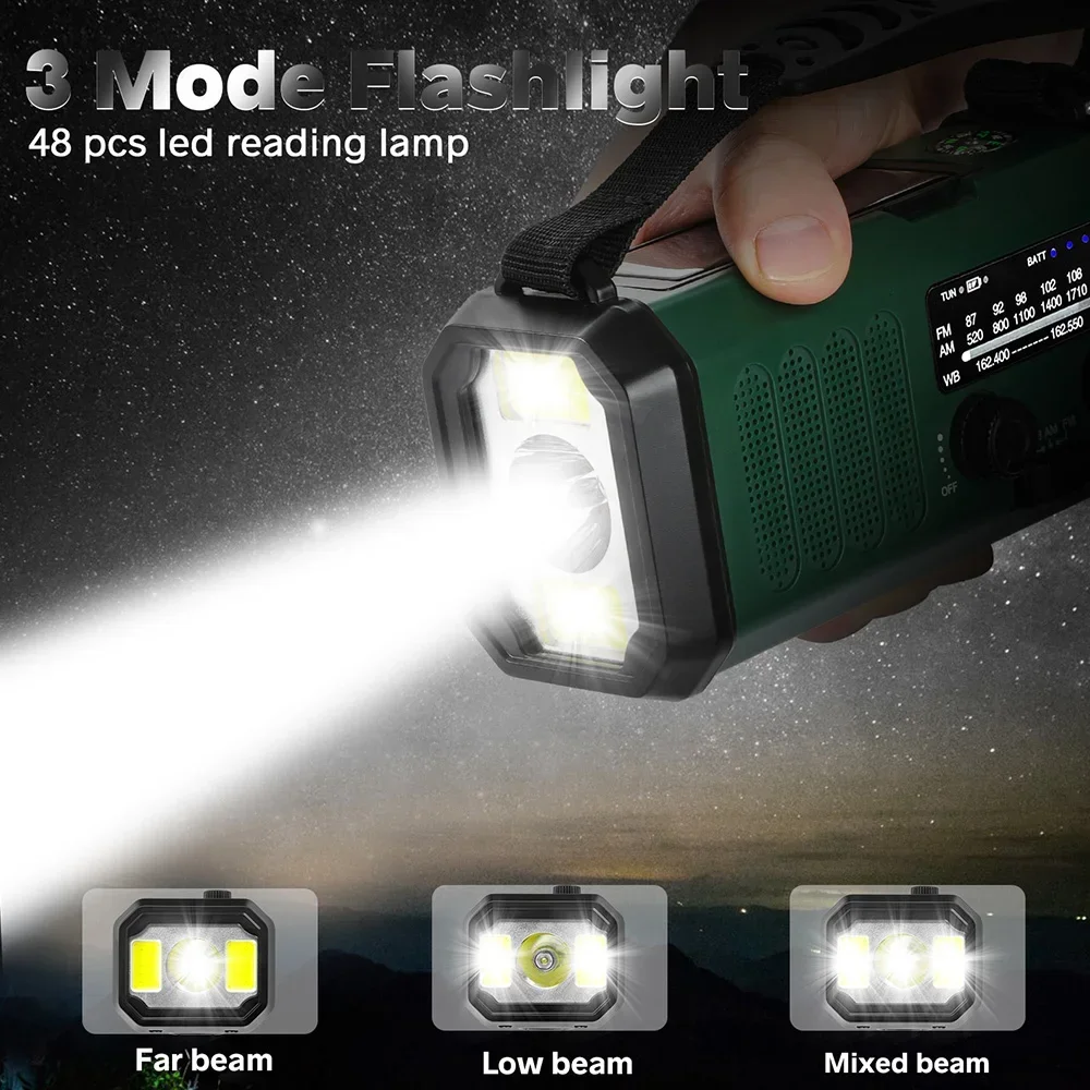 4. With Flashlight: Radio has multi-function, not only can send out distress signals, receive information, but also with a flashlight, when necessary, the flashlight mode can be turned on to illuminate the night. Can be charged by solar and hand crank.