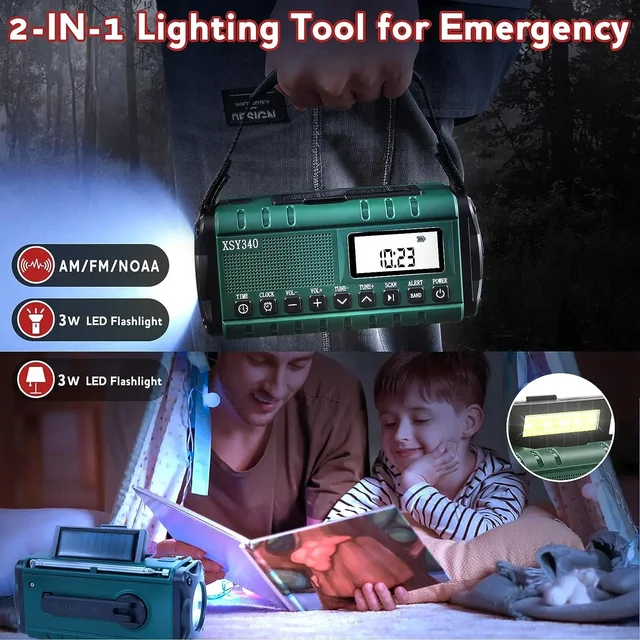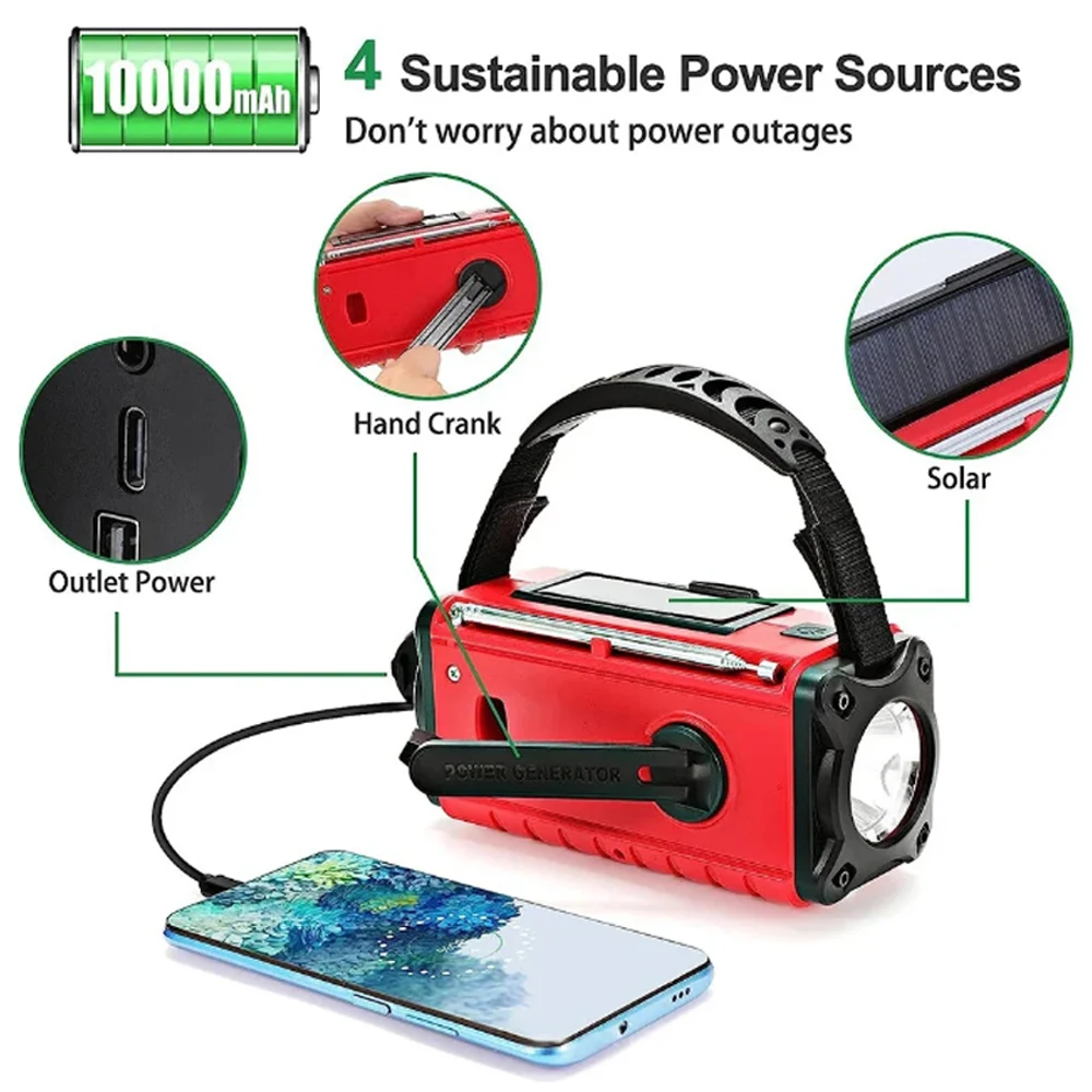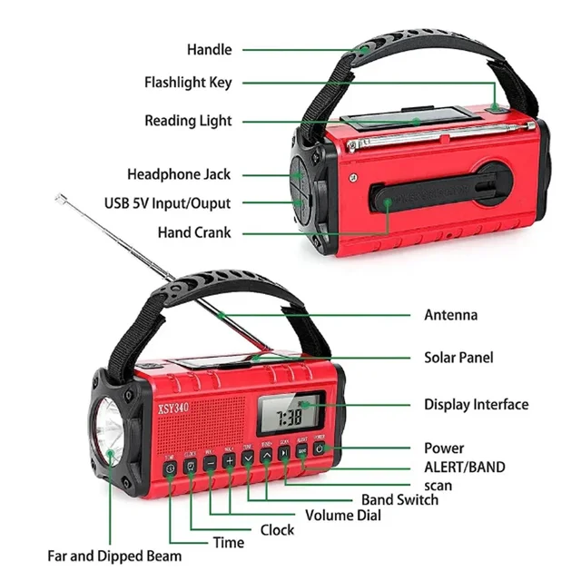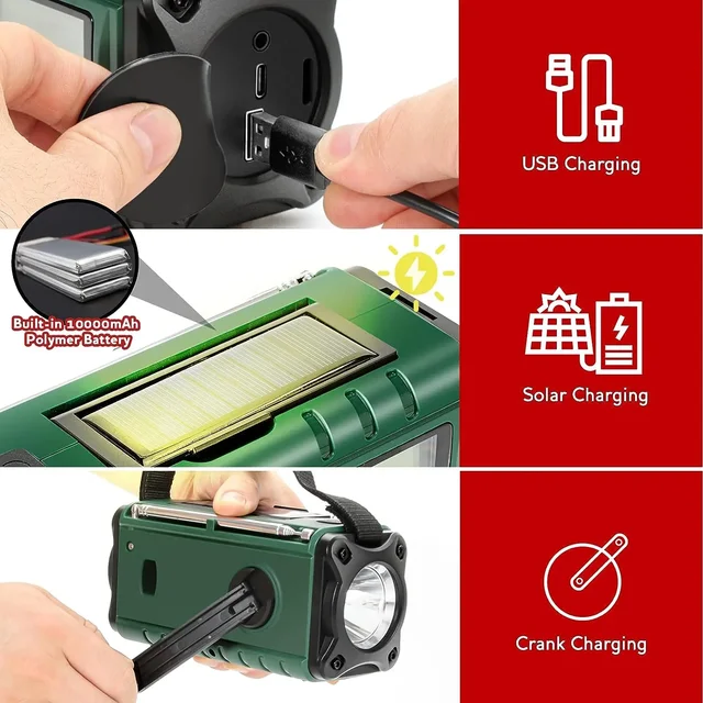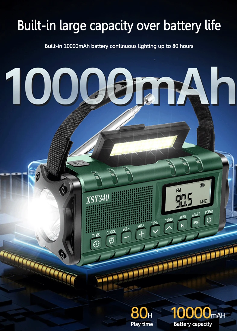 Function: USB-C port, built-in speaker alarm clock, SOS alarm clock, flashlight, reading light, weather radio, FM/AM radio, mobile phone charger, etc.
