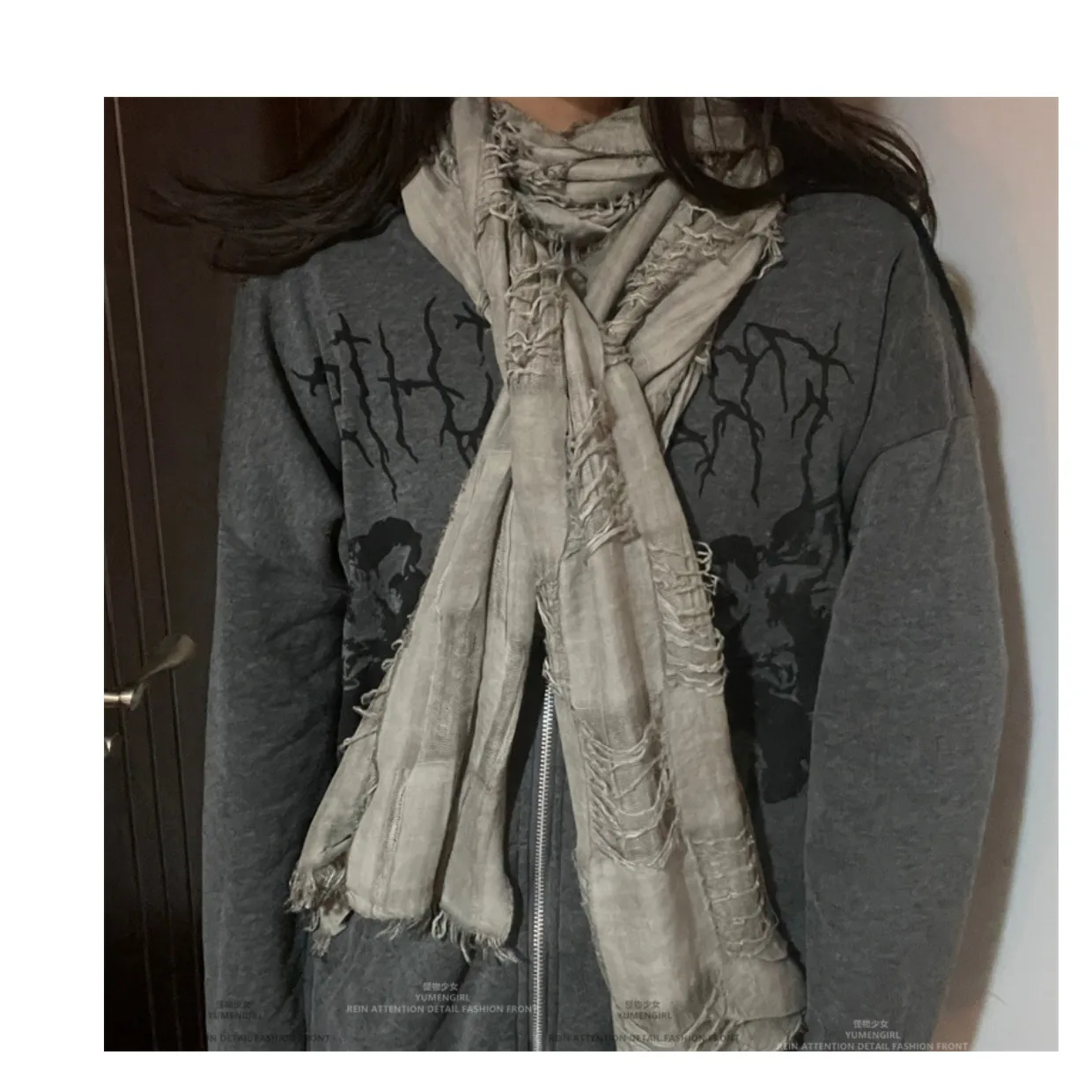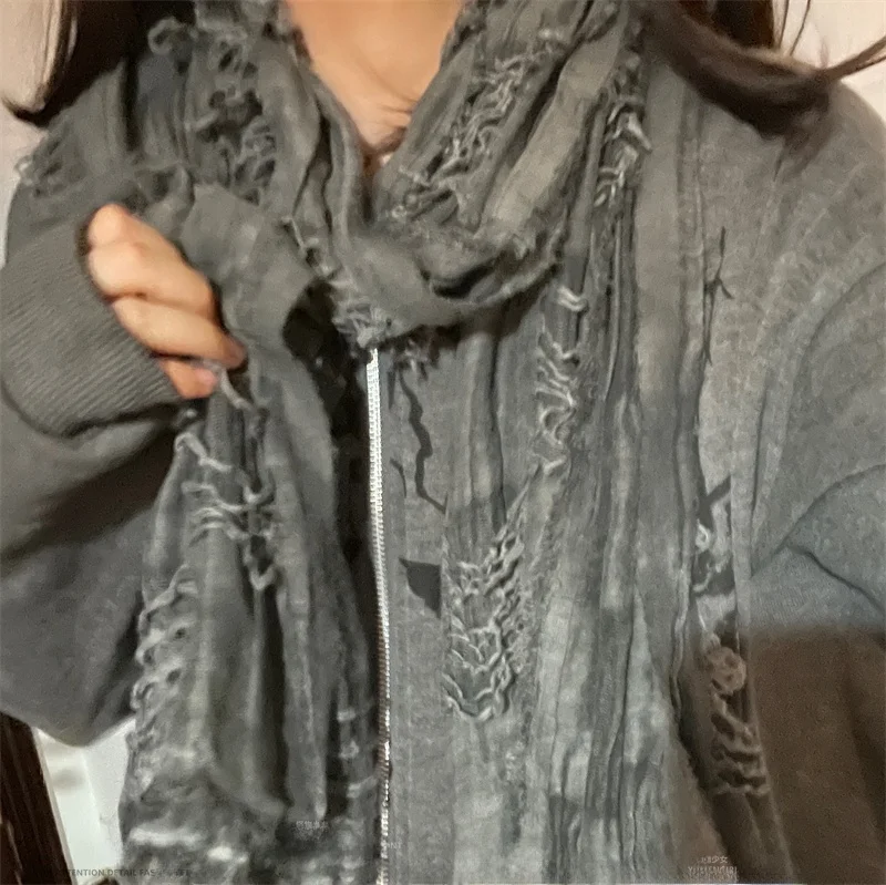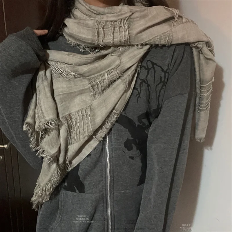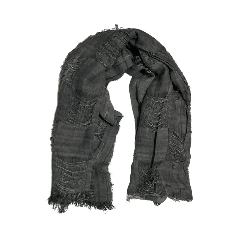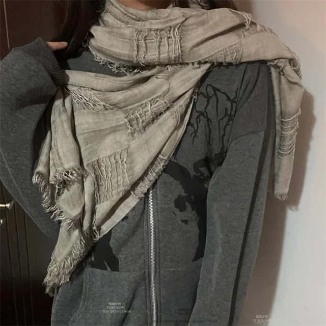 This scarf features a unique distressed fringe design, blending futuristic and post-apocalyptic aesthetics for a bold, trendy look suitable for both men and women.