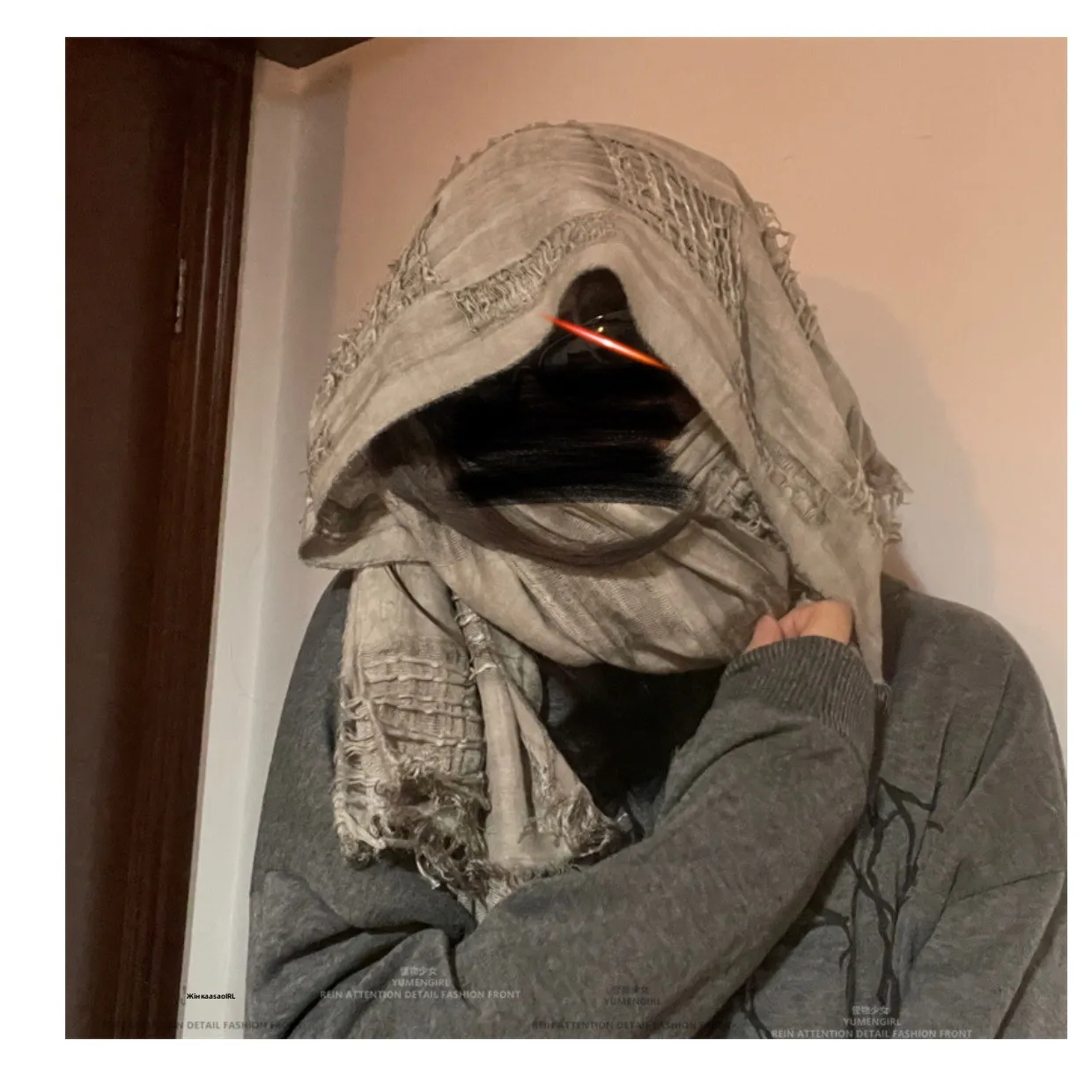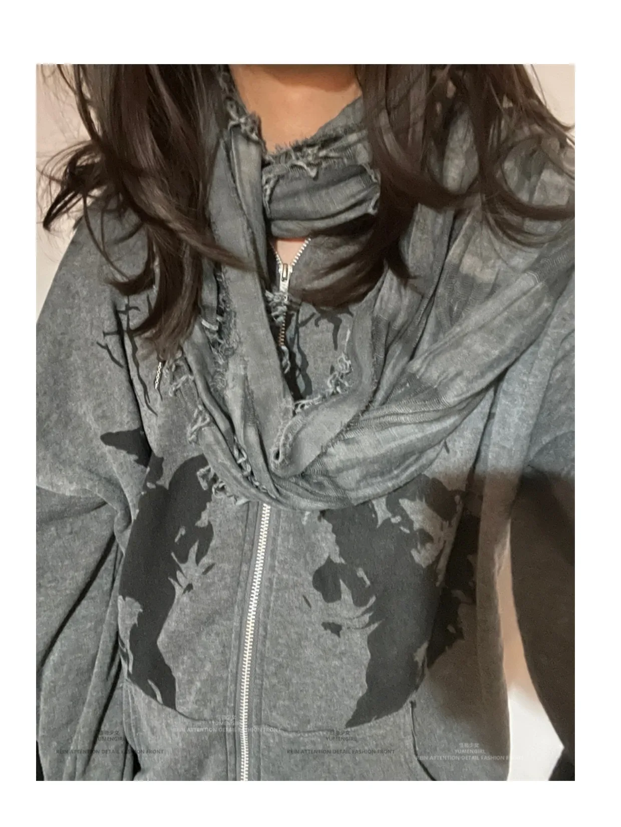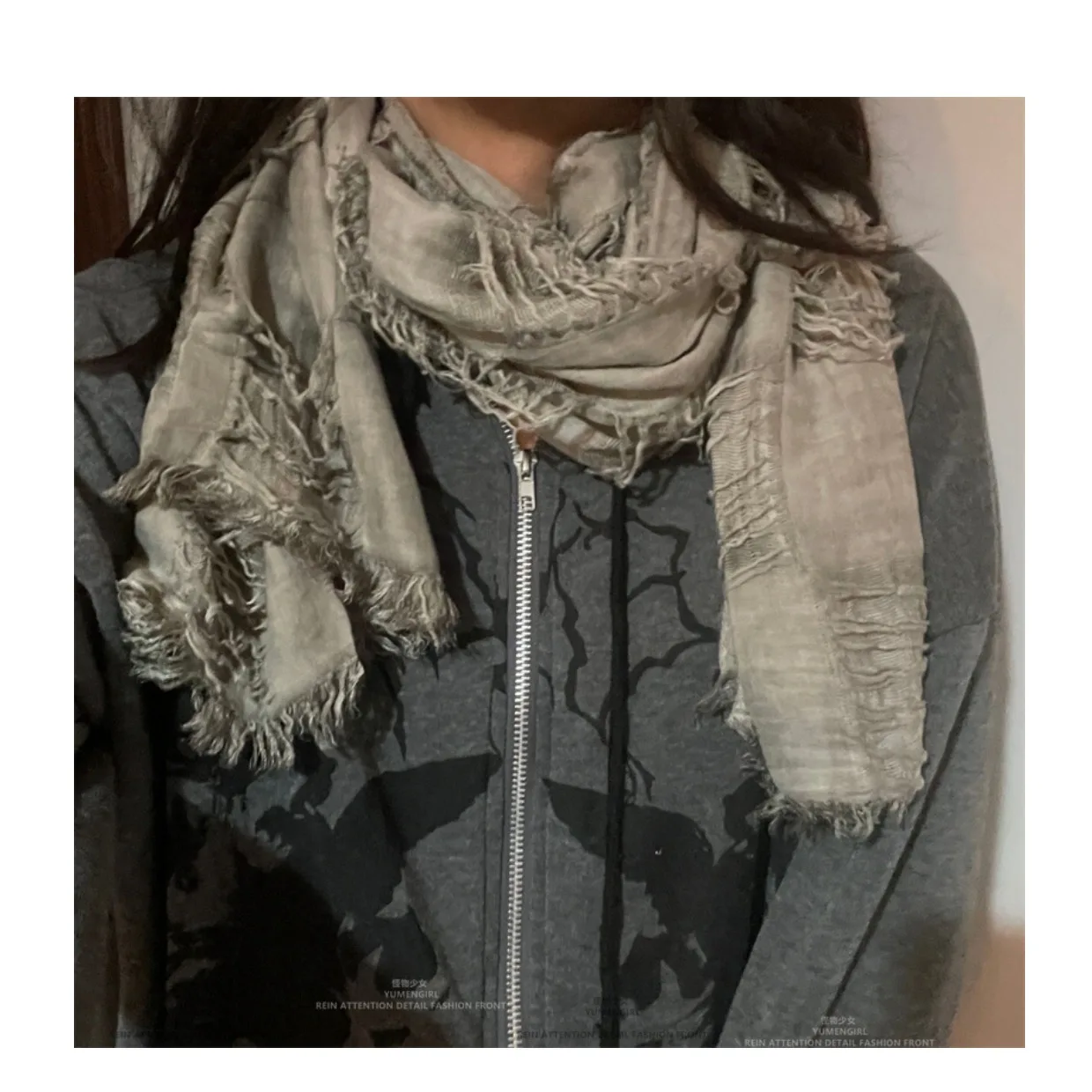 This scarf features a unique distressed fringe design, blending futuristic and post-apocalyptic aesthetics for a bold, trendy look suitable for both men and women.