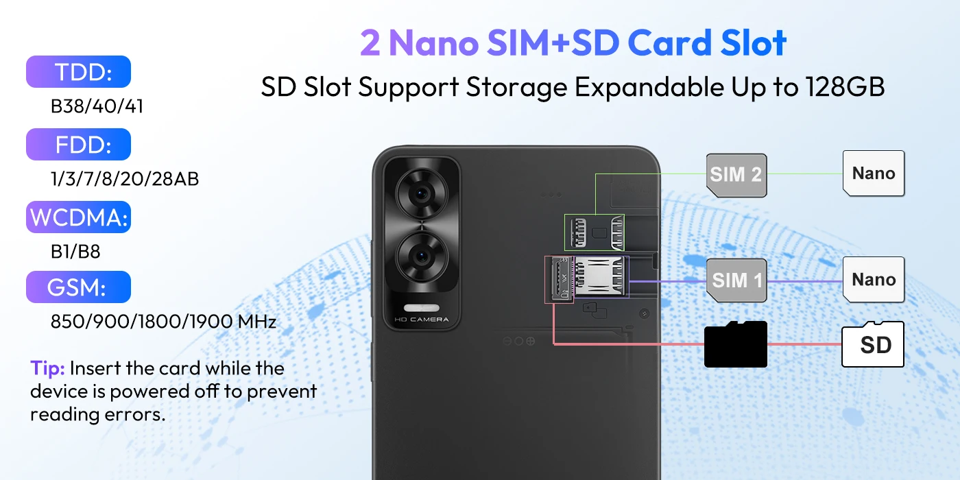 SIM card: Triple card slots, 2 SIM card slots and 1 TF card slot