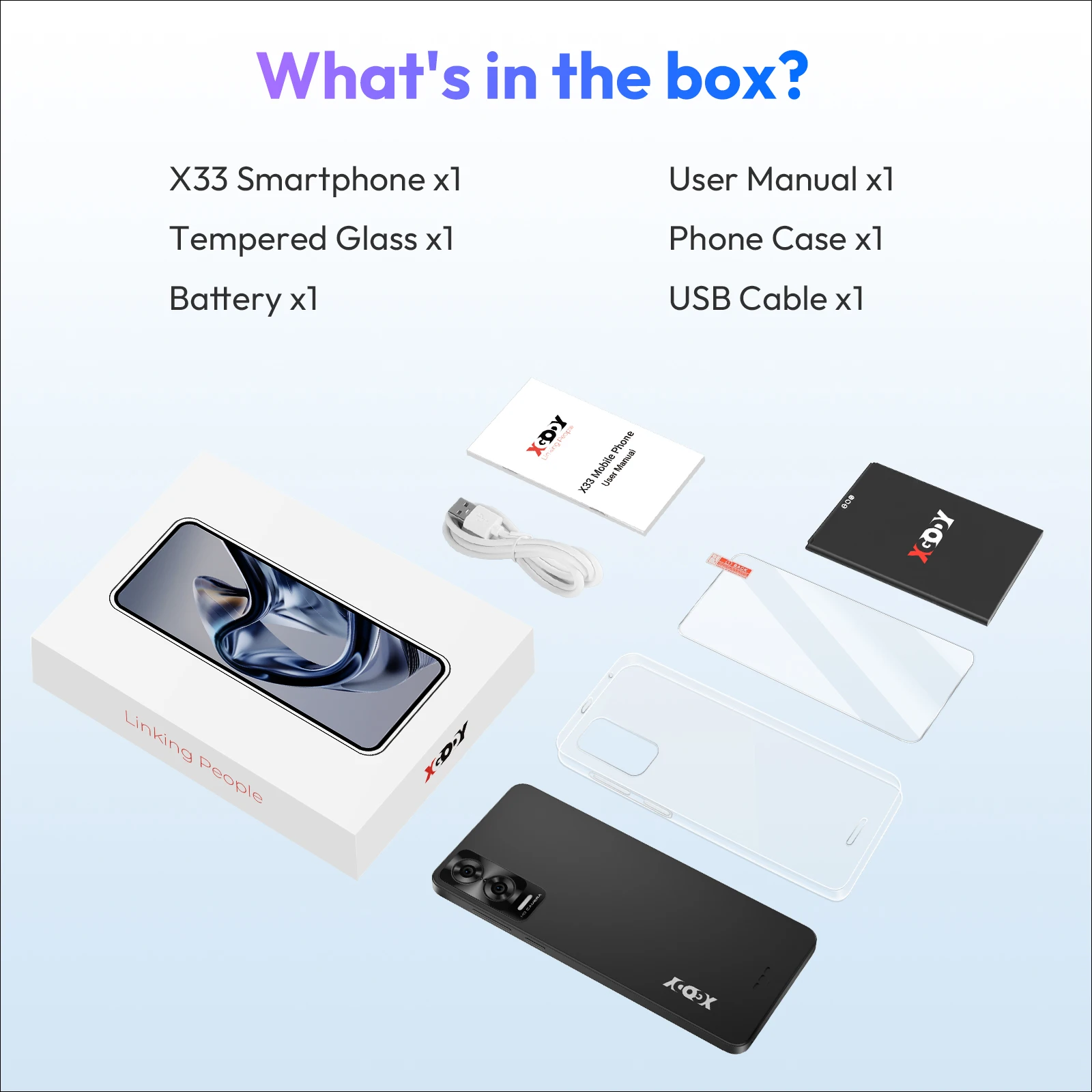 Accessory kit:Â 1 tempered glass screen protector, 1 phone case
