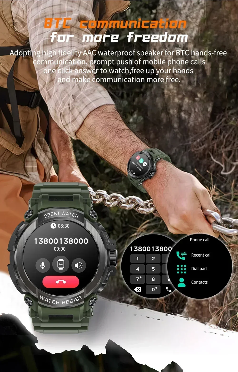 The watch can receive and make calls, and sync contacts and records with the phone.