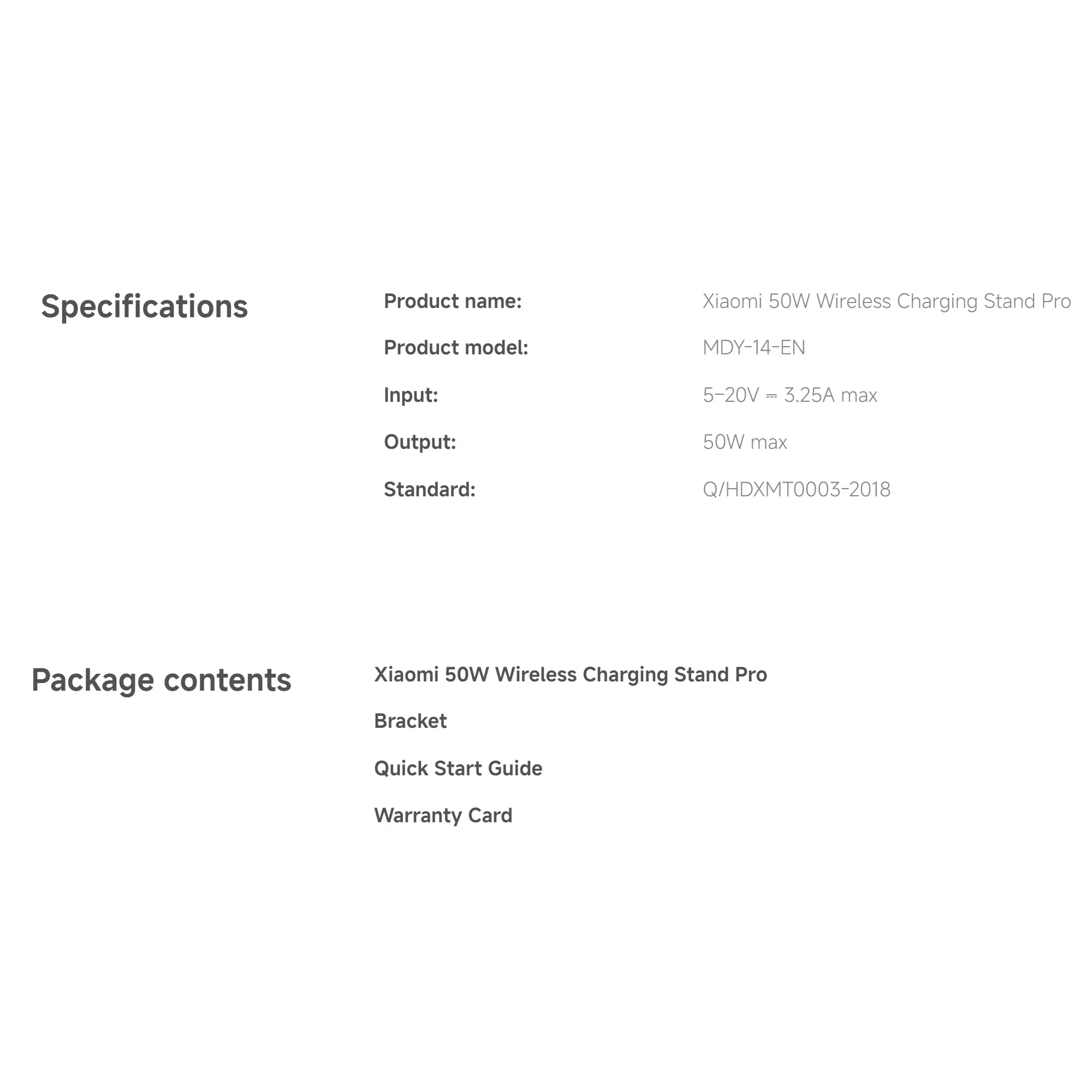 | Package contents | Xiaomi 50W Wireless Charging Stand Pro Bracket Quick Start Guide Warranty Card |