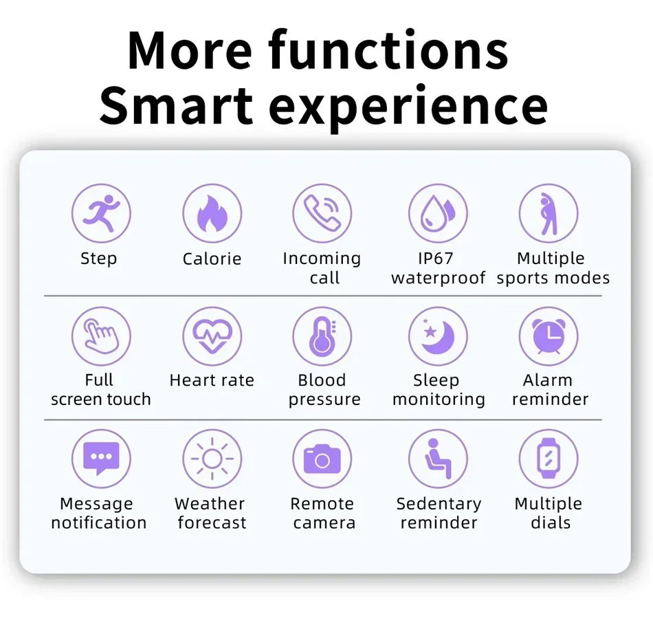 Information Reminder There are function enable switches on the APP side (incoming calls, text messages, Wechat, QQ, Facebook, Twitter, LinkedIn, WhatsApp, Line, Instagram, Snapchat, Skype and other mobile applications) and events such as sitting, alarm clock, drinking water, taking medicine, etc. Information reminder, alarm clock, photo, raised wrist screen, sedentary reminder, stopwatch, countdown, search for mobile phone, bracelet brightness adjustment, bracelet screen duration adjustment, step counting, heart rate data synchronization APP support, exercise, mileage, calories, Steps, sleep, total sleep, deep, light sleep time, history record, heart rate, blood pressure, sleep, exercise