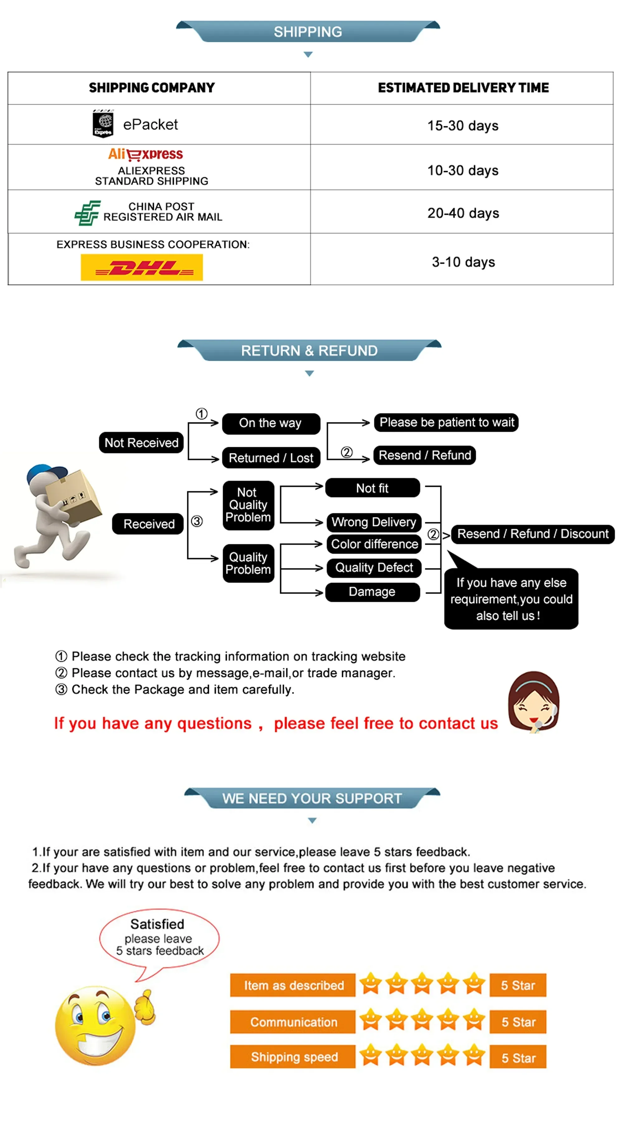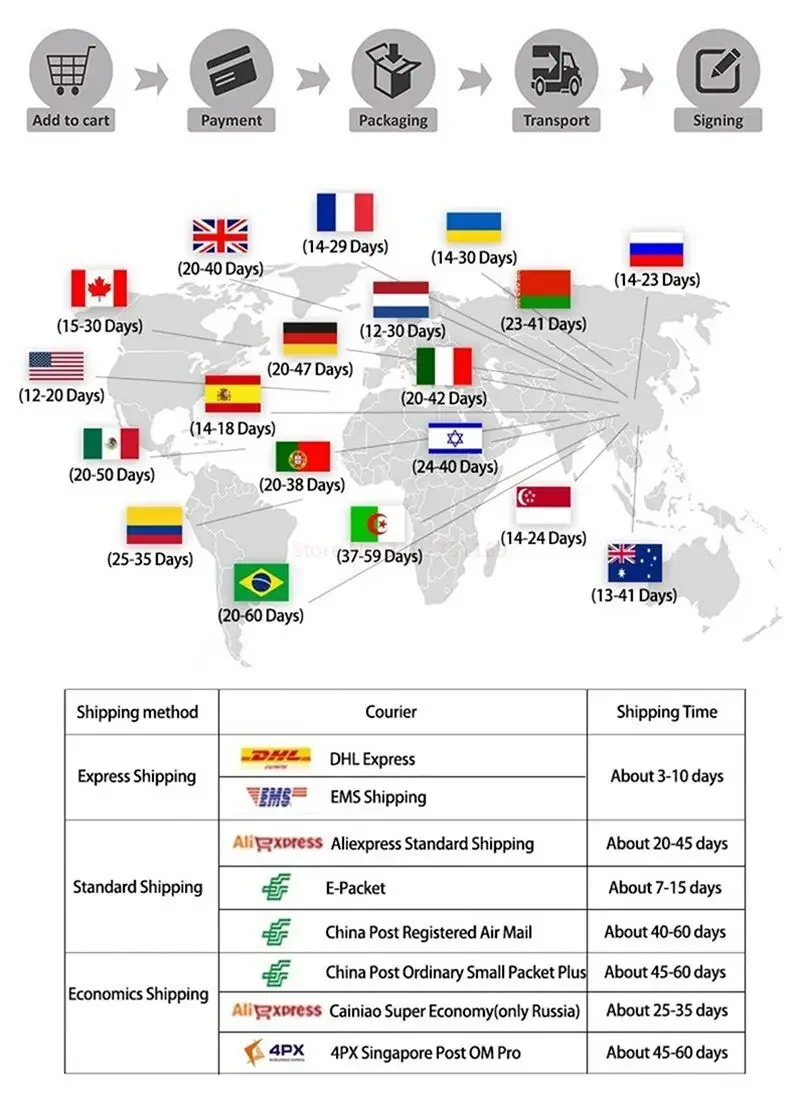 Important notice, due to abnormal logistics on the buyer side page of the platform, the displayed arrival time is incorrect. We hereby declare that we are sending a logistics route of the same level as the worry free standard. Usually, the actual arrival time in each country is 8-15 days in the United States. Mexico 9-16 days. Brazil takes 10-20 days. South Korea 8-16 days. Chile 12-22 days. France 9-15 days. Spain 8-15 days. Israel 10-17 days.
