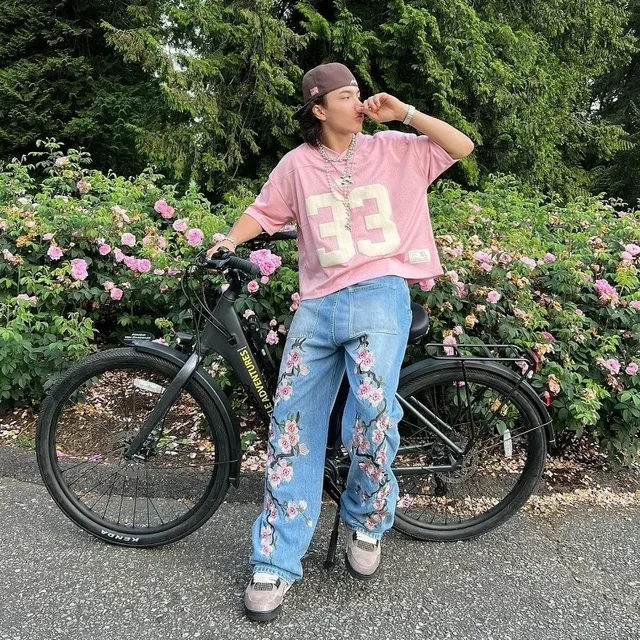Y2K pants men Baggy Harajuku cherry blossom print pattern jeans Hip Hop streetwear