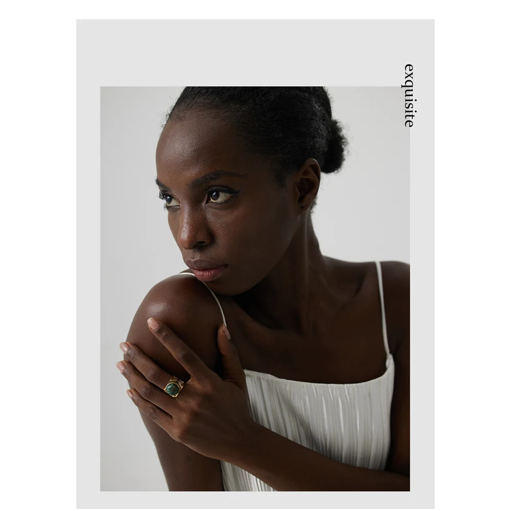 Yhpup Stainless Steel Green Natural Turquoise Opening Ring Statement Golden 18 K Plated Ring bague acier