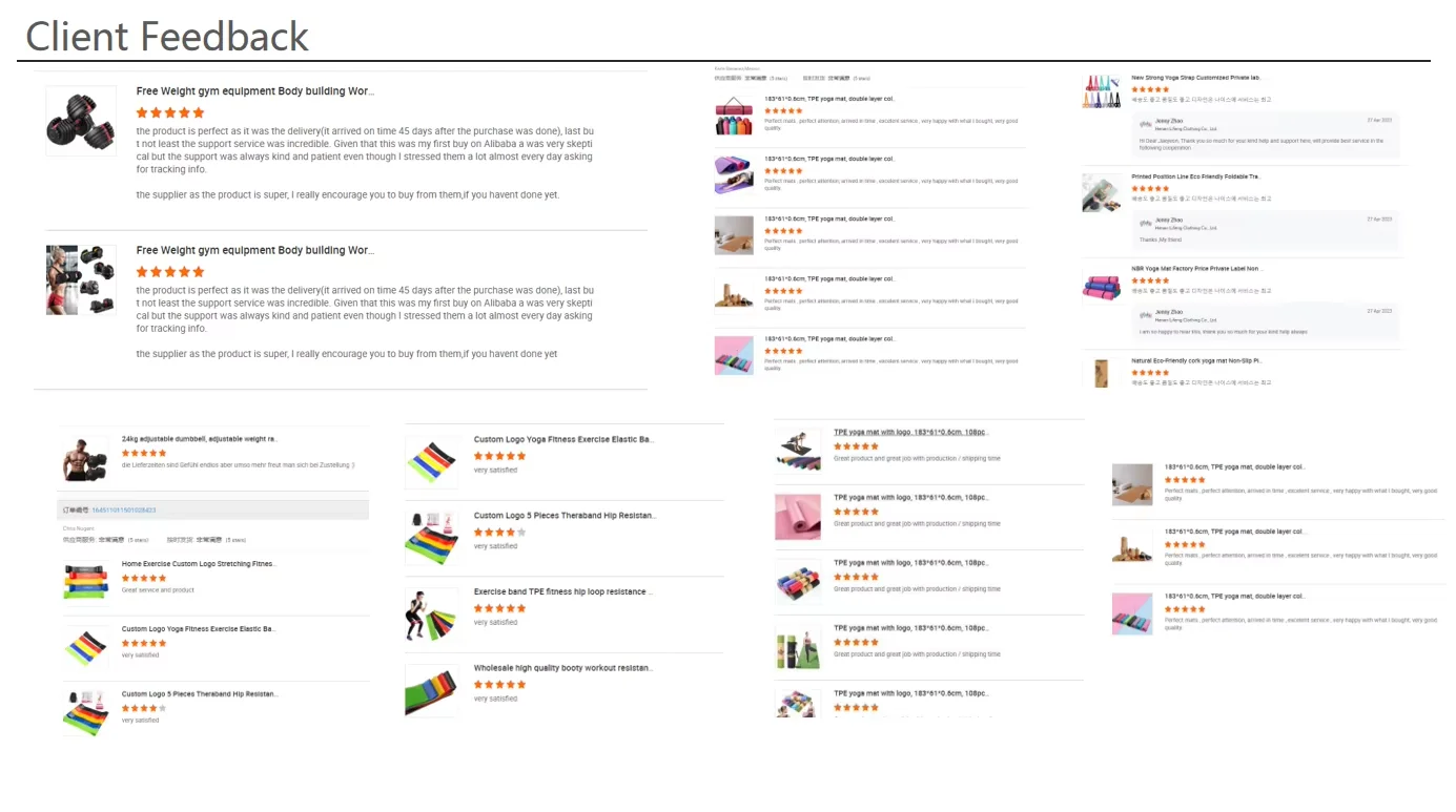 Our company specializes in sports products, such as yoga and strength training equipment, providing world capabilities for fitness enthusiasts, distributors and retailers. Its warehouse is 1,200 square meters and consists of 12 employees. It can provide customers with high -quality products, professional product market plans, after -sales service and rapid delivery.