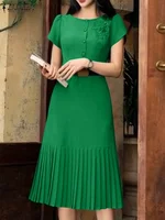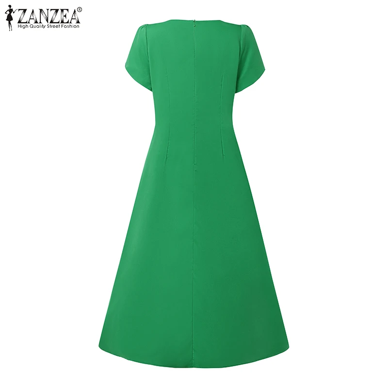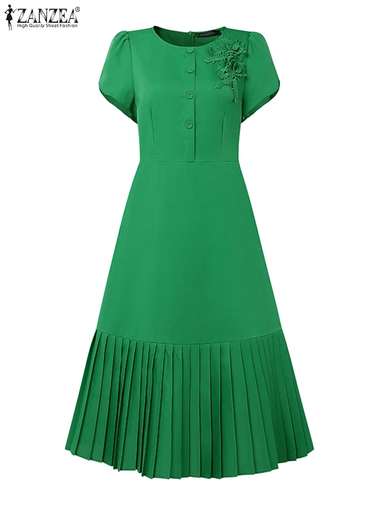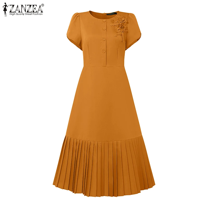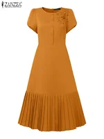 ZANZEA 2025 Summer Dress Women Pleated Sundress Fashion Solid Color Short Sleeve Casual Loose Robe A-Line