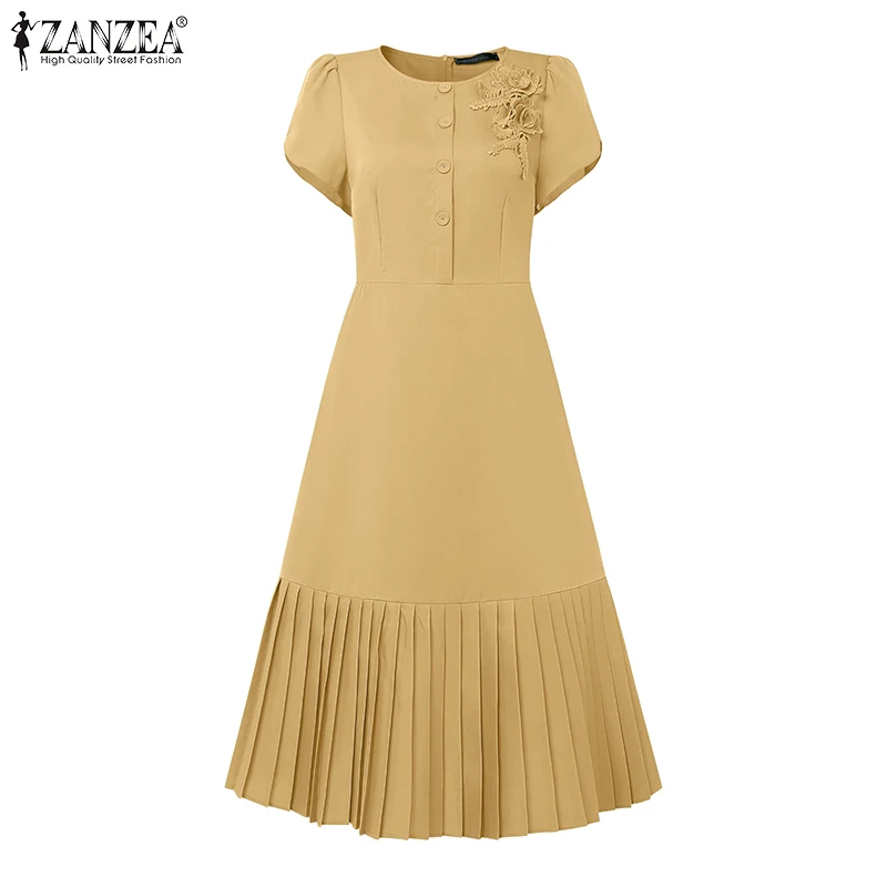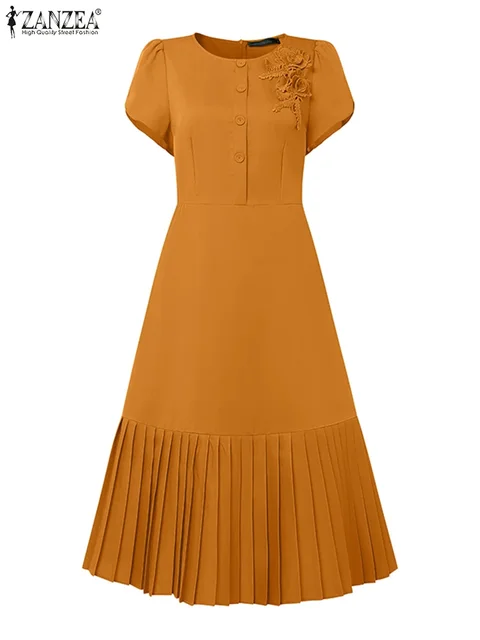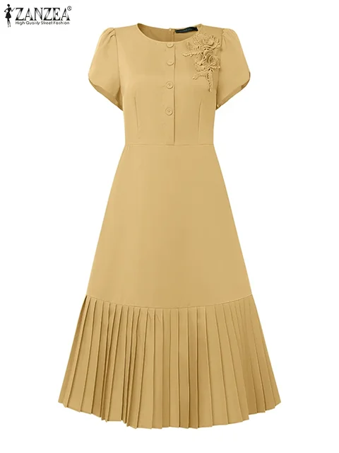 ZANZEA 2025 Summer Dress Women Pleated Sundress Fashion Solid Color Short Sleeve Casual Loose Robe A-Line Party Vestidos S-3XL