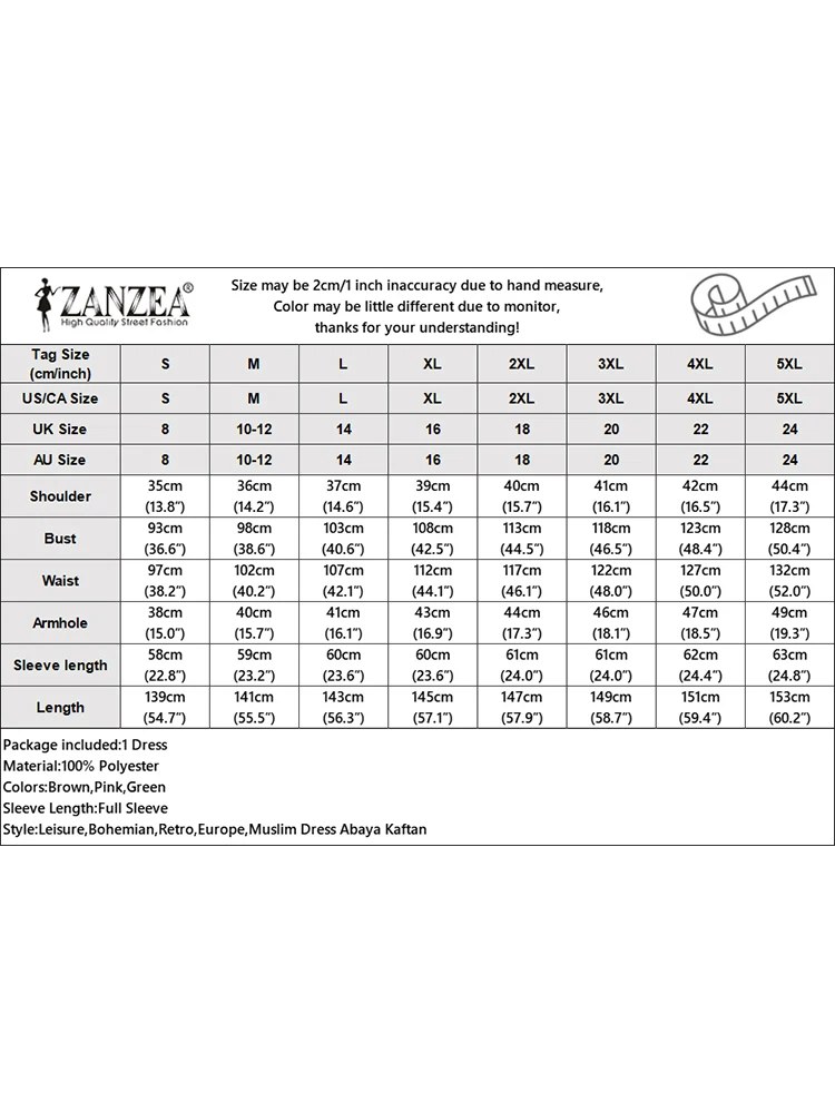 | Package included:1 Dress Material:100% Polyester Colors:Brown,Pink,Green Sleeve Length:Full Sleeve Neckline:O-Neck Pattern:Floral Prints Length:Mid-Calf Length Buckle chain:Buttons on the back Thickness:Thin Style:Leisure,Bohemian,Retro,Europe,Muslim Dress Abaya Kaftan Season:Spring,Summer,Autumn Occasion:Family,Party,Wedding,Holiday,Employment Label: Yes Attentions: 1.The Real Object May Exist Slightly Colors Differences Compared To Images As Different Computers Display.Caution If Minding,Thanks. 2.There Might Be A Manual Measuring 1-3 cm Error.Sorry For Any Inconvenience. 3.Please Prevail On Real Item, Model Images For Reference Only. 4.Attention!!!Please check the size chart carefully before placing the order.