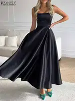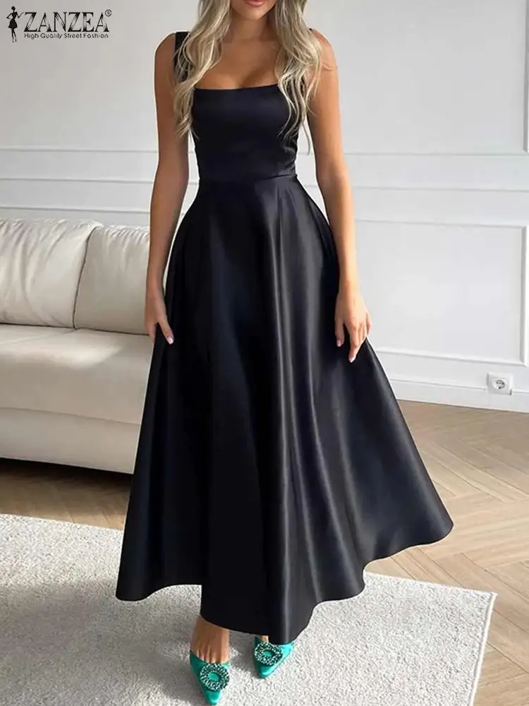 ZANZEA Sexy Strap Tank Dresses Women Fashion Square Collar Maxi Sundress Vintage Satin Waisted Dress