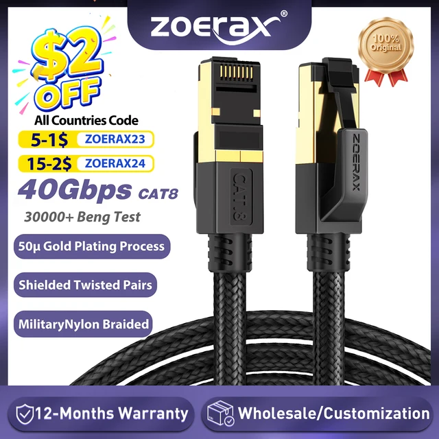 ZoeRax Ethernet cable featuring shielded twisted pairs, aluminum foil shielding, ground wire, and durable nylon jacket.