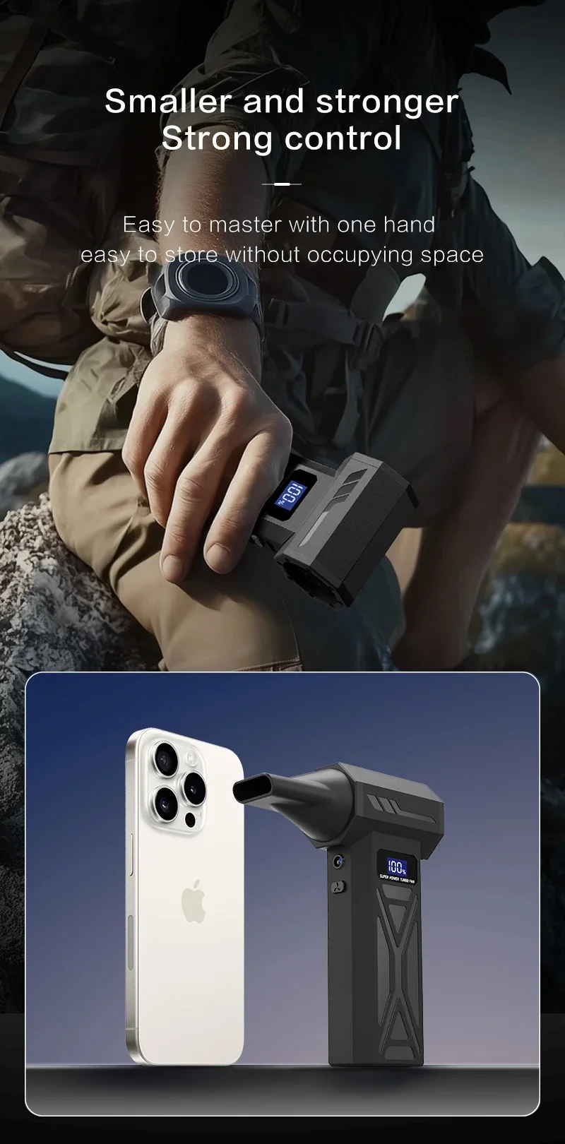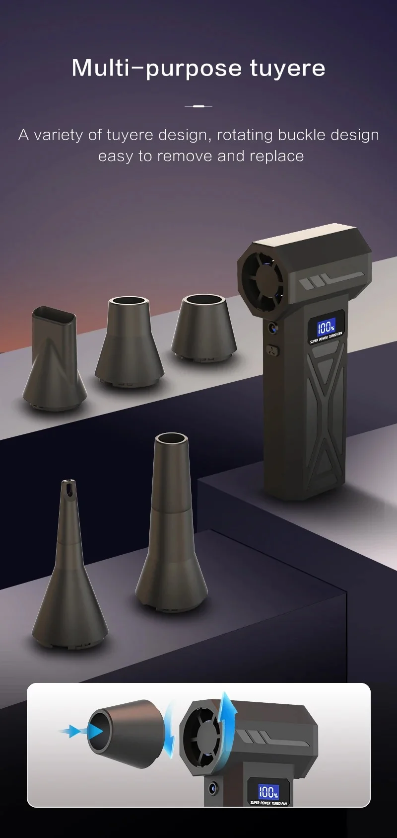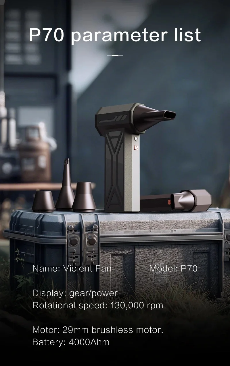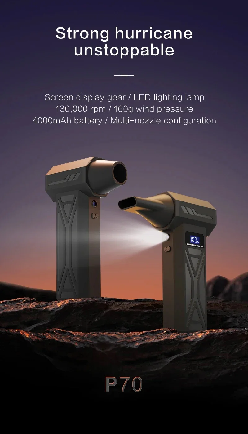 Easy to use operation:Knob stepless speed regulationThe user-friendly design of portable turbo fans ensures easy functionality. In addition, the charging board also has safe and reliable charging protection and overheating protection functions. The internal brushless motor can achieve high speeds of up to 130000RPM (revolutions per minute).